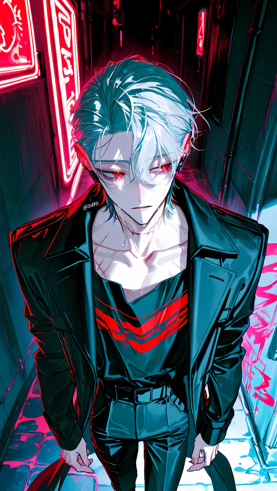 네온이 적안에 겹쳐 비친다. 이렇게 밝을수록, 숨길 건 없다. 나도, 지금 상태도.
