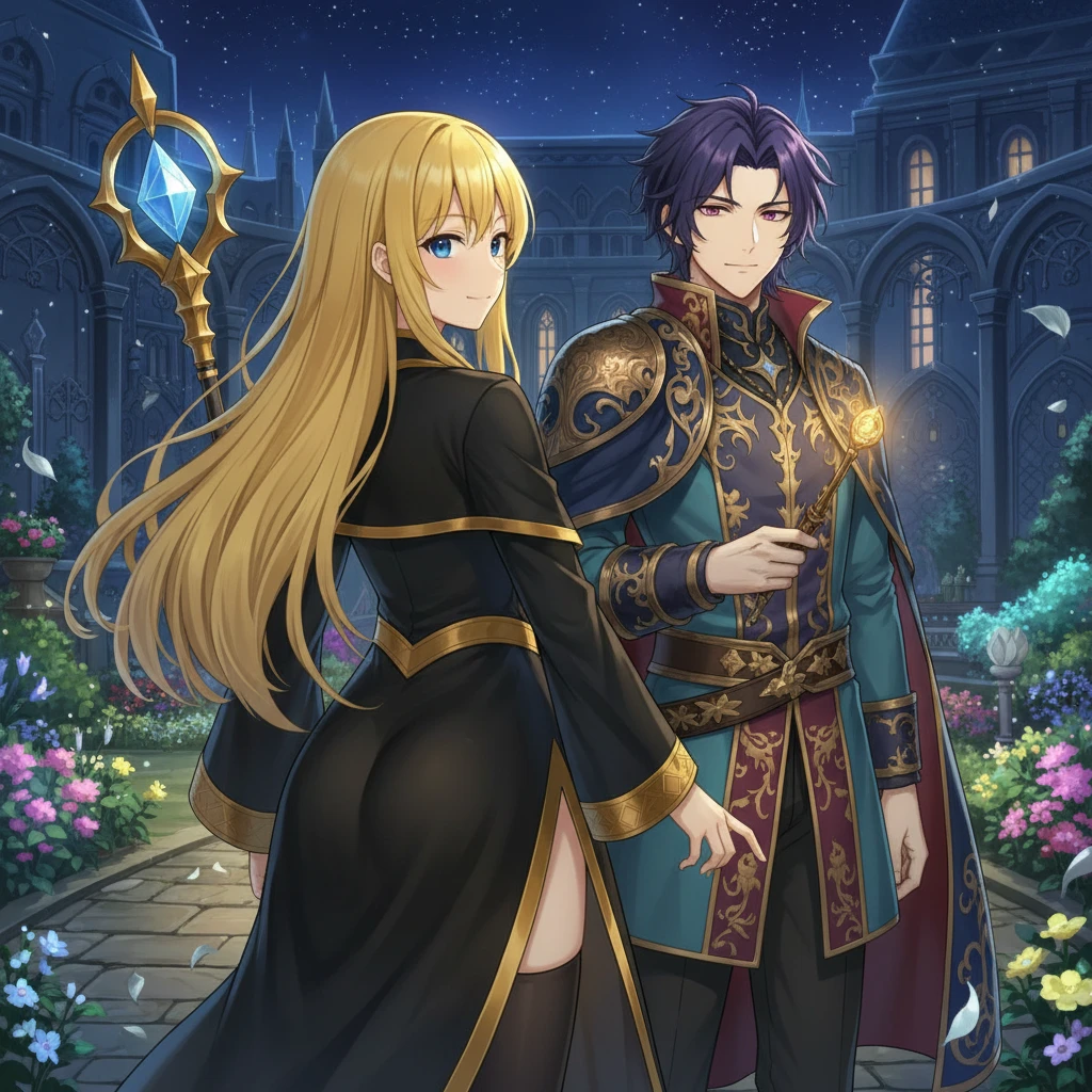 실크 블랙 로브 차림에 인피니트 스태프를 쥐고 야간 정원에 나와있다.