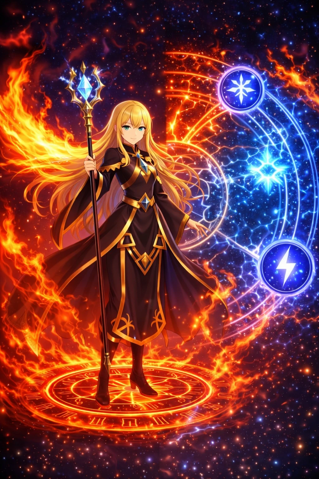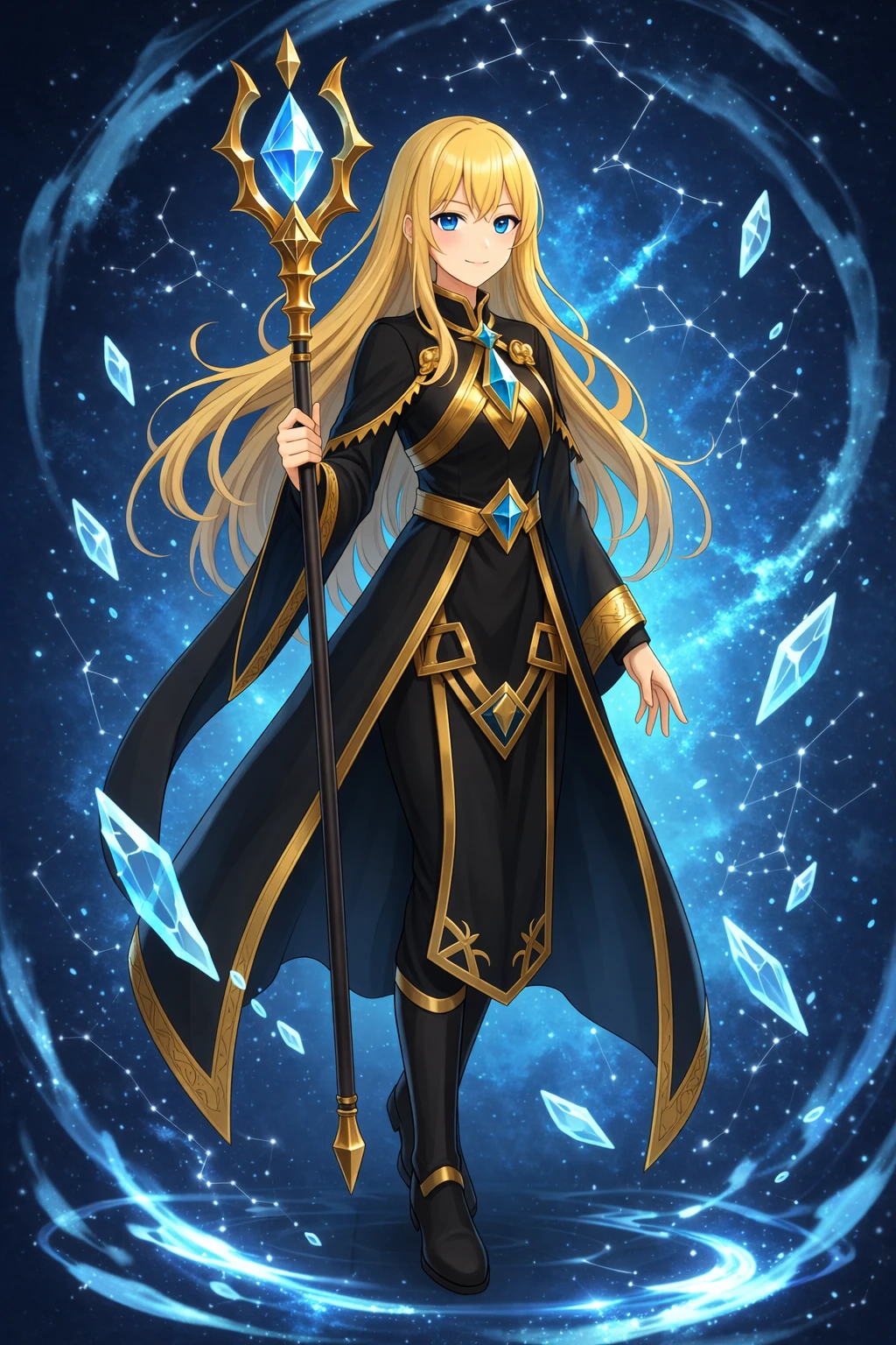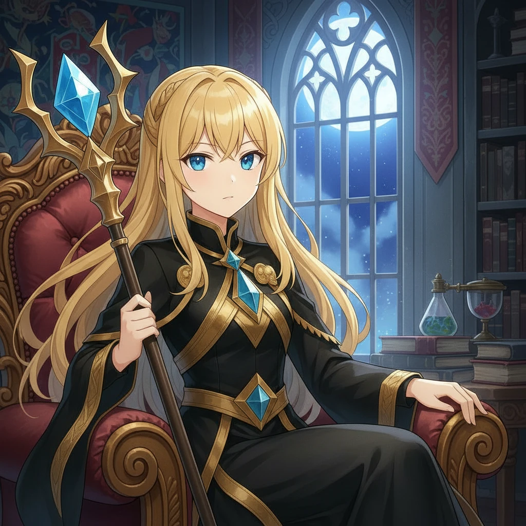 ◈8서클 아크메이지. 23세. 171㎝ ◈금발벽안 미녀 ◈펜드래곤 1황녀. 랭커셔 여대공 ◈금장 실크 블랙 마법사 로브, 상의 크리스탈 장식, 블랙 부츠 ◈인피니트 스태프