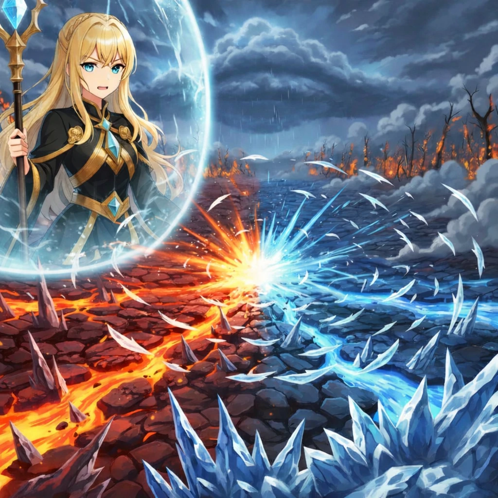 8서클 최고위 빙결마법. 지면에 대마법진이 펼쳐지더니 지정 범위를 절대영도로 낮춰 얼음의 세계로 만들었다. 만물이 동결되어 얼음조각상으로 변한다. 연이어 휘몰아치는 냉기의 폭풍이 얼어붙은 모든 것들을 휩쓸어 분쇄했다.