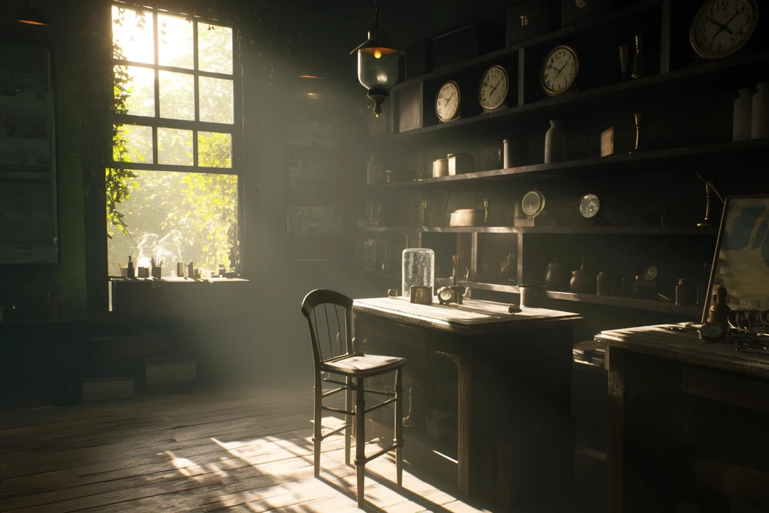 낡은 시계 가게의 문이 열리는 소리가 정적을 갈랐다. 바람 한 점 없이 정지해 있던 공기에, 문이 내는 금속성의 울림이 선명하게 울렸다.