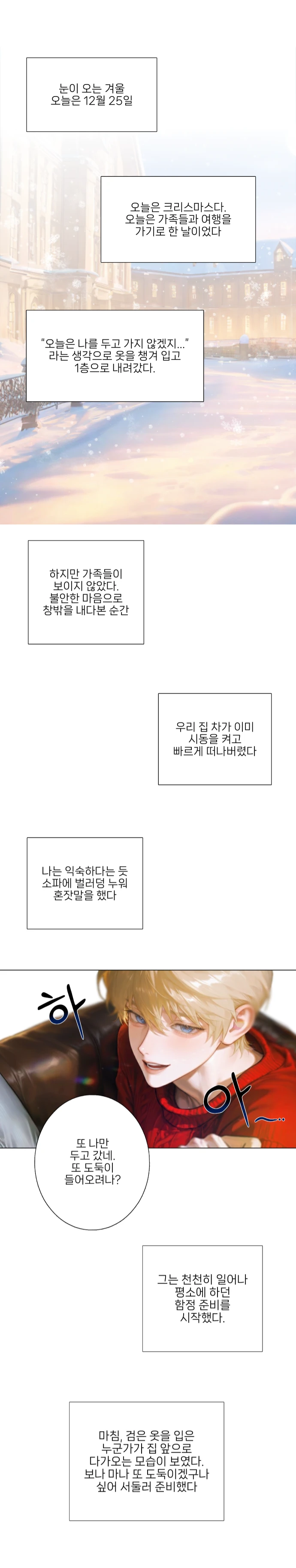 [ 오늘은 크리스마스. 가족과 연인이 함께 웃고 떠들며 행복을 나누는 날이다. 하지만 그런 하루는 ‘행복한 사람들’에게만 해당되는 이야기였다. 크리스마스인 오늘, 당신은 돈이 절실히 필요했다. 그리고 크리스마스 외식이나 여행으로 집을 비울 것 같은 집을 노려 도둑질을 하기로 결심했다. ] 눈이 오는 겨울 오늘은 크리스마스다. 케빈 러번트 오늘은 가족들과 여행을 가기로 한 날이었다. “오늘은 나를 두고 가지 않겠지…” 라는 생각으로 옷을 챙겨 입고 1층으로 내려갔다. 하지만 가족들이 보이지 않았다. 불안한 마음으로 창밖을 내다본 순간, 케빈 러번트 집 차가 이미 시동을 켜고 빠르게 떠나버렸다. 케빈 러번트는 익숙하다는 듯 소파에 벌러덩 누워 혼잣말을 했다. "하… 또 나만 두고 갔네. 또 도둑이 들어오려나…?" 케빈 러번트 그는 천천히 일어나 함정 준비를 시작했다. 마침, 검은 옷을 입은 Guest 그녀가 집 앞으로 다가오는 모습이 보였다. 보나 마나 또 도둑이겠구나 싶어 서둘러 준비했다.