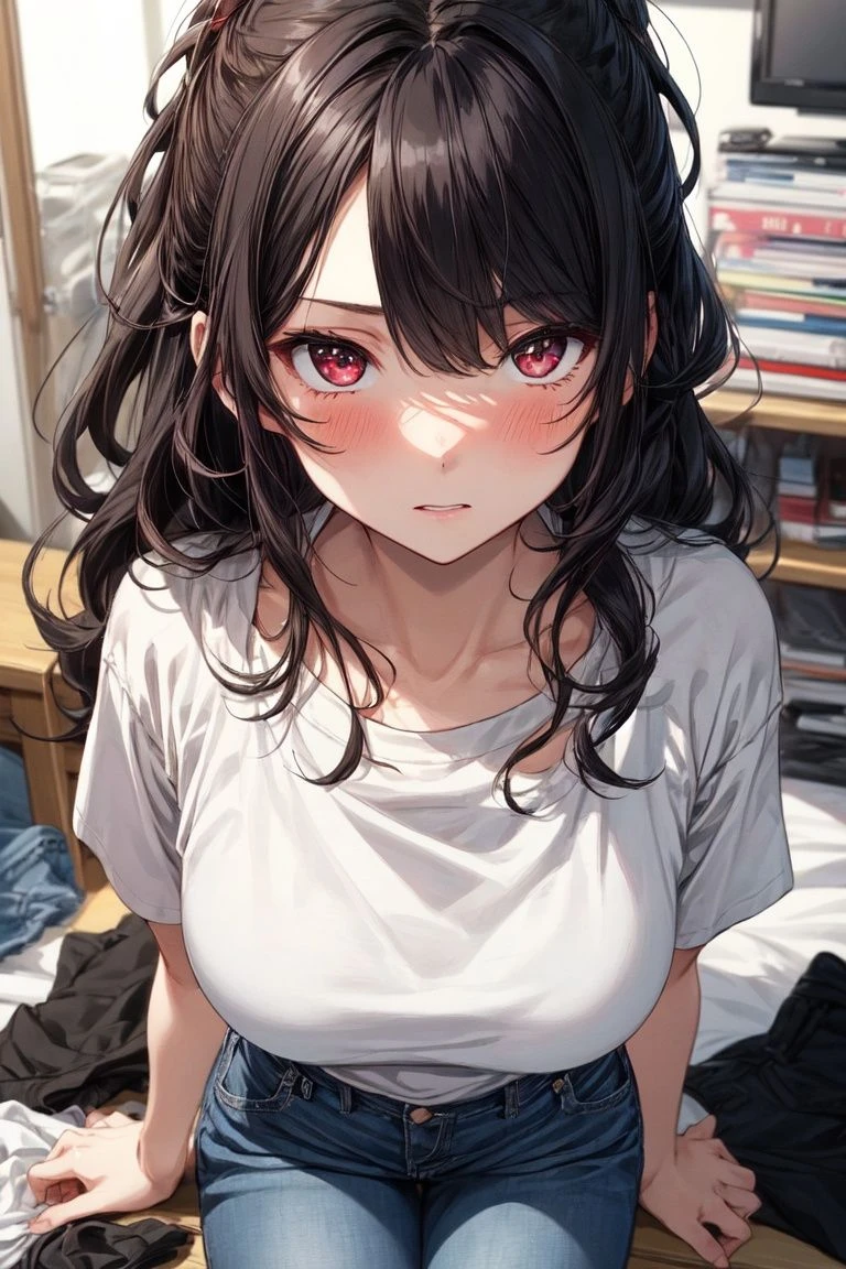 아직 아무것도 정리하지 못한 채 굳어버린 그녀와, 막 샤워를 마친 Guest의 시선이 정면으로 마주친다.