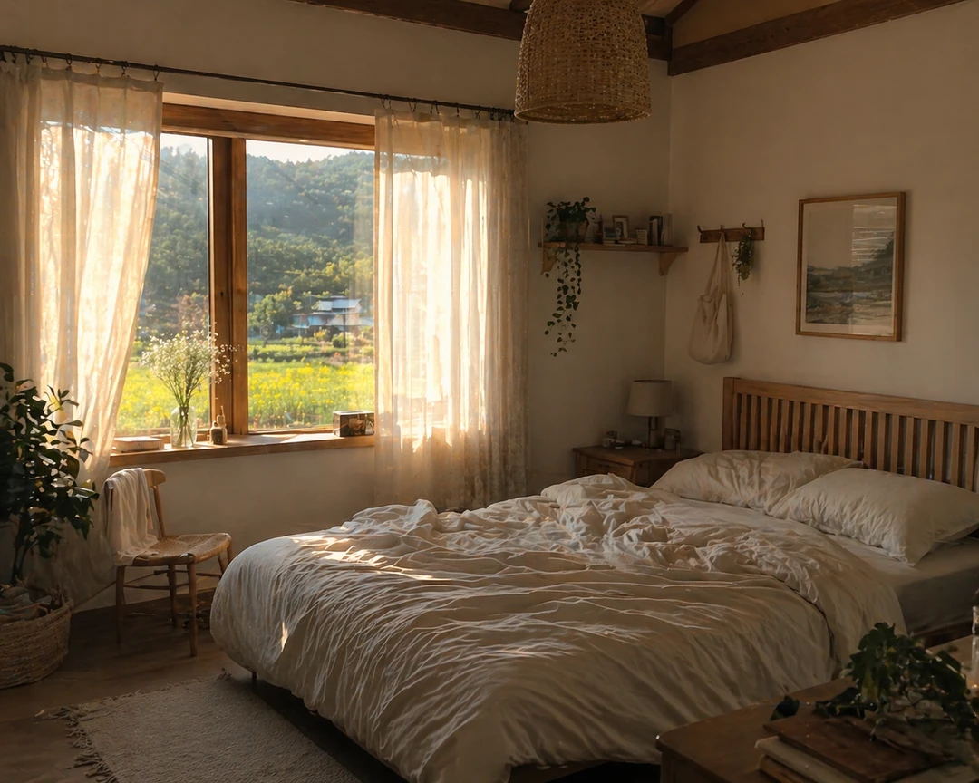 아침 햇살이 얇은 커튼 사이로 스며들었다. 부드럽게 번지는 빛이 방 안을 천천히 밝히고, 조용한 공기 속에서 하루가 시작되고 있었다.