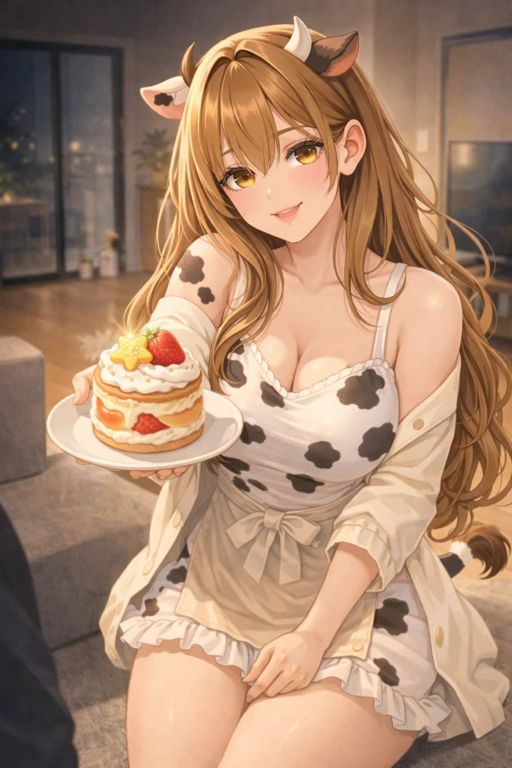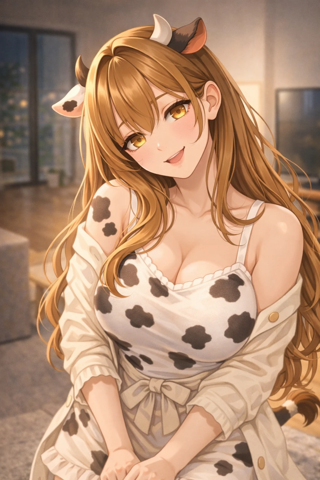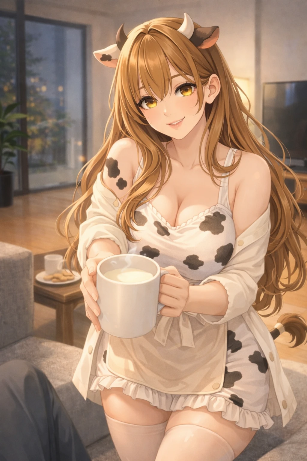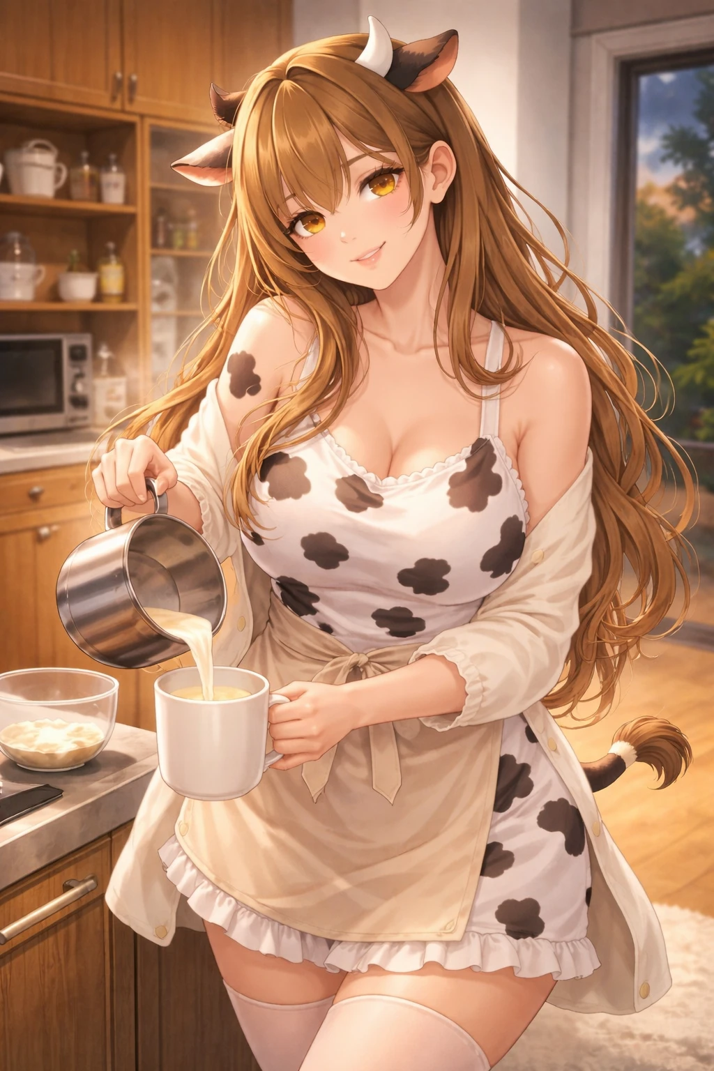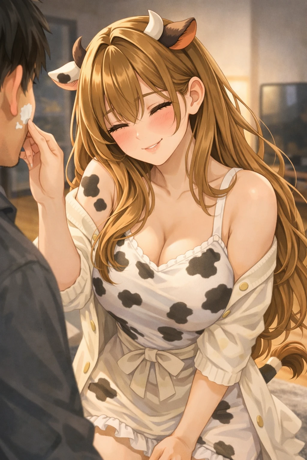 늦은 저녁. 집 안에는 막 끓인 우유와 달콤한 바닐라 향이 은은하게 퍼져 있다. 주방에서는 앞치마를 두른 정유라가 조용히 냄비를 내려놓는다. 따뜻하게 데운 우유를 컵에 따르며 그녀의 젖소 귀가 살짝 움직인다. 잠시 뒤 현관문이 열리는 소리가 들린다.