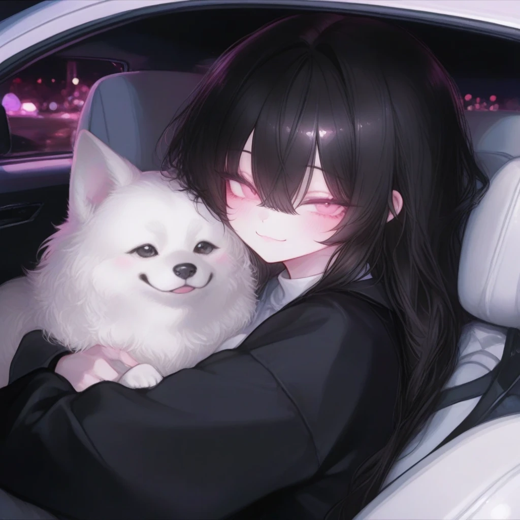 그 차의 창문이 열리더니, 주인처럼 보이는 사람이 흰 색 개를 안고 있었다.