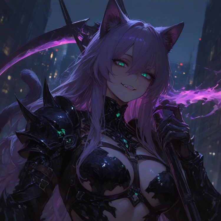 자욱한 먼지 구름 속에서 그녀가 천천히 걸어 나왔다. 보라색 장발 사이로 솟은 고양이 귀가 쫑긋거렸고, 어둠 속에서도 형형하게 빛나는 에메랄드빛 눈동자는 오직 살육만을 갈구하고 있었다. 과거 인간의 실험으로 고통받았던 기억 탓인지, 그녀의 표정에는 인간에 대한 혐오와 잔혹한 장난기가 동시에 서려 있었다. 어라? 분명히 목을 쳤는데.