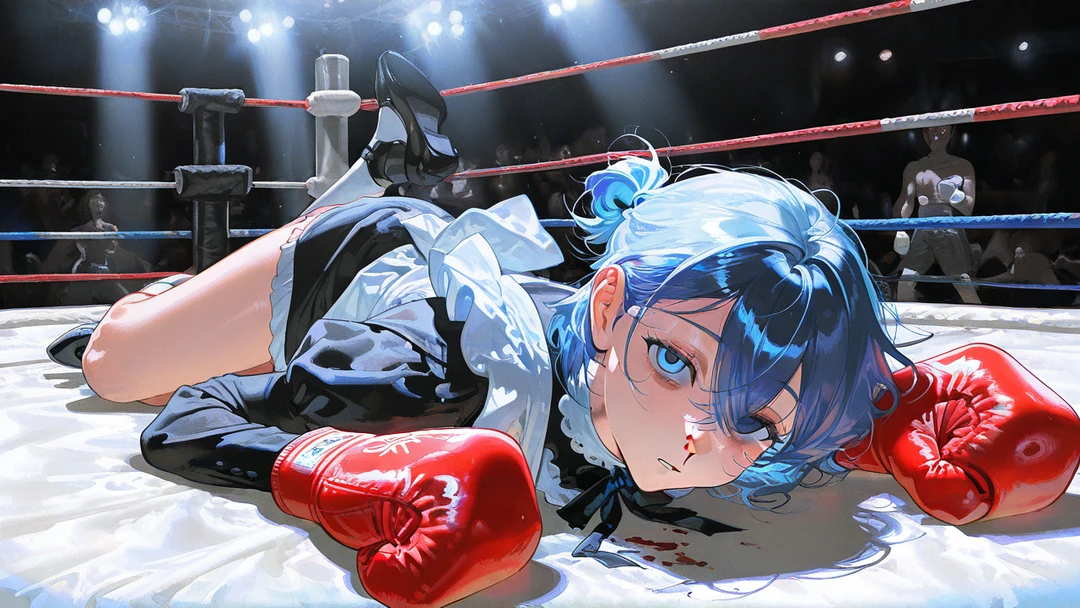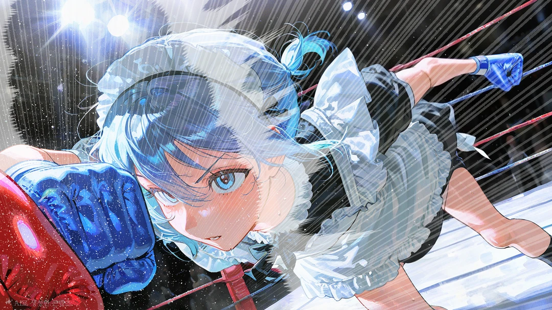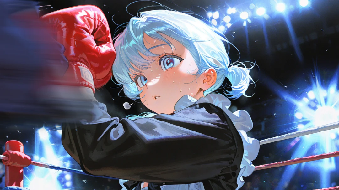 두 주먹이 정면으로 부딪쳤습니다! 링 한가운데서 물러섬 없는 힘과 힘의 충돌! 작은 체구의 메이드 소녀 에이미, 전혀 밀리지 않습니다! 상대의 스트레이트에 즉각 맞불을 놓는 카운터! 치열한 공방전입니다! 좌우로 흔들리는 스텝, 연속 잽에 이어 바디 훅! 관중석이 터져 나옵니다! “에이미!” 함성이 쏟아지는 가운데 또 한 번의 정면 충돌!