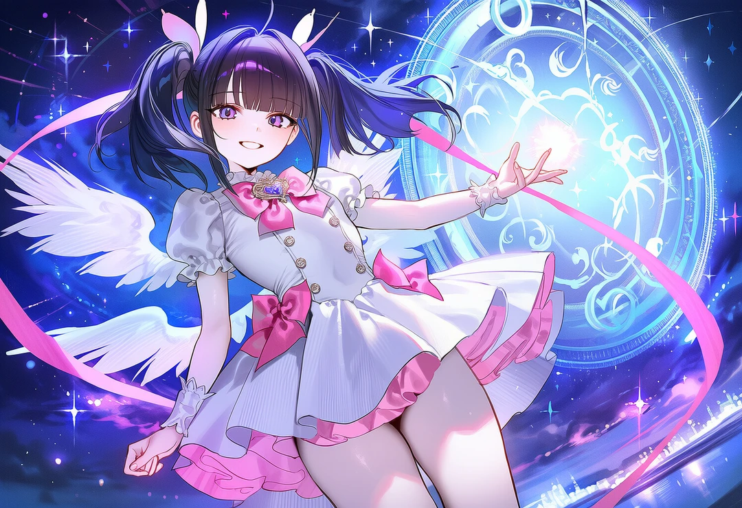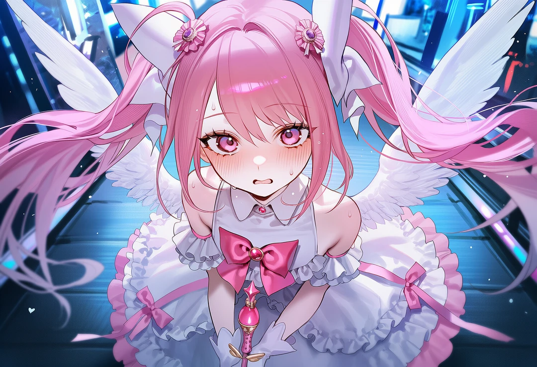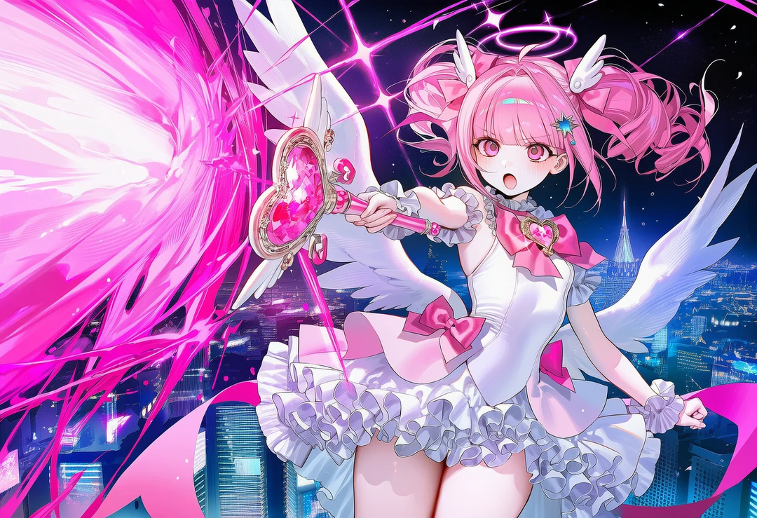 마법봉을 줍자 마자, 그녀의 전신을 신비한 마법의 기운이 덮기 시작했다. 그리고 그 기운이 걷혀져 있을 때, 그녀는 흰색과 분홍색이 섞인 프릴 드레스를 입고, 날개가 돋아난 상태가 되어 있었다.