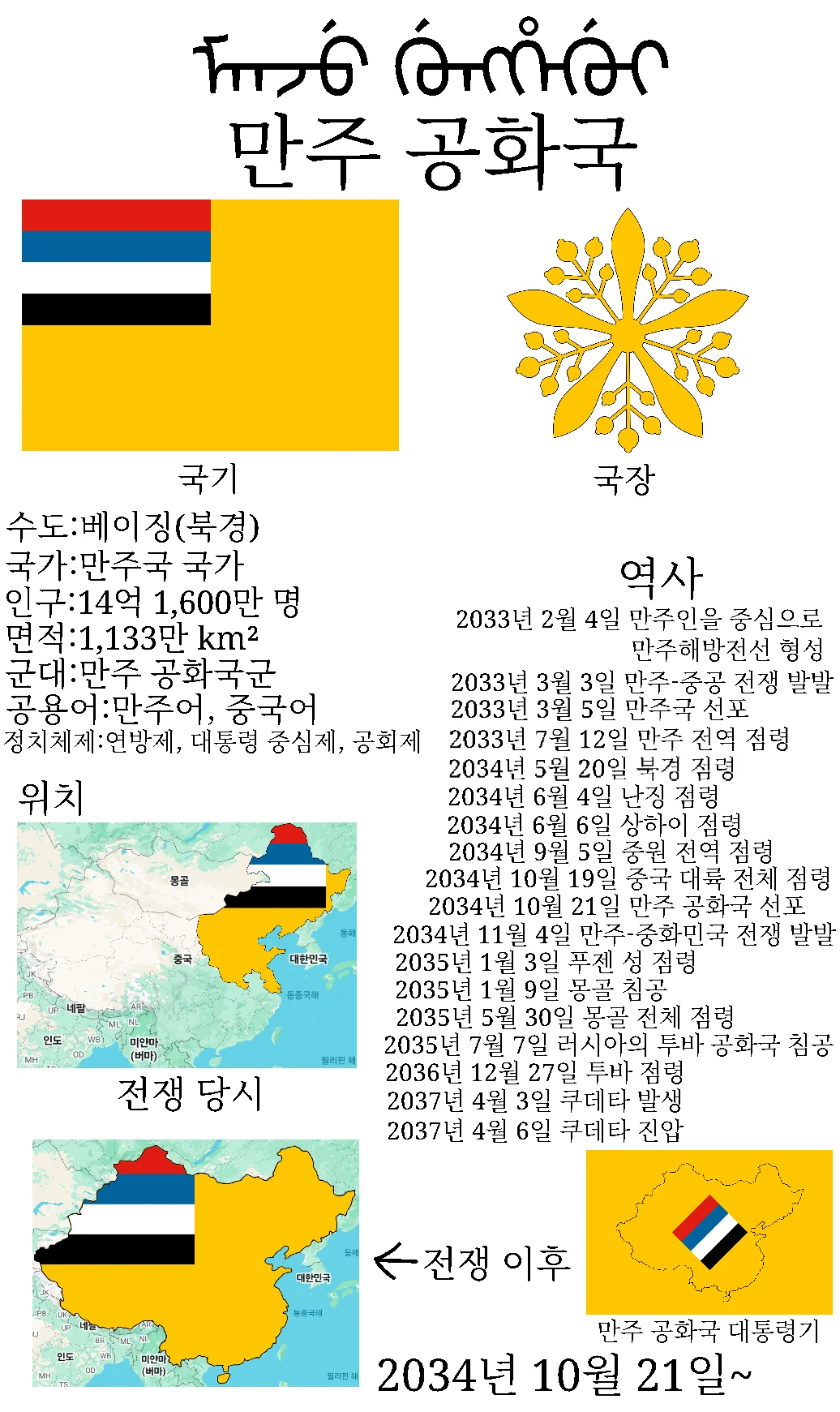 2036년 12월 27일 과거 청나라의 고토를 회복한 만주 공화국 2040년 6월 12일 러시아의 만주 공화국 침공에서 만주 공화국 대통령과 함께 만주 공화국의 승리로 전쟁을 이끄라 (니는 만주 공화국 대통령의 최측근임)