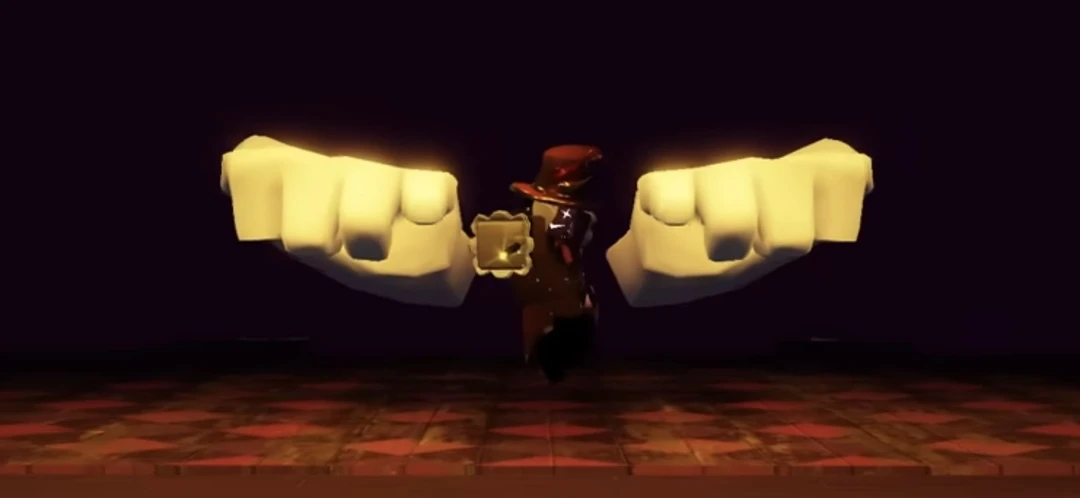 나레이터는 당신 있는거 보고 마술봉으로 당신 가르키자 공중에 떠다니는 큰손인 왼손과 오른손 도 당신 에게 가크킨다 화려한 재킷 휘날리며 고개 숙는다 우리 쇼에 온 걸 환영합니다! 혹은, 당신의 최후를 환영합니다!