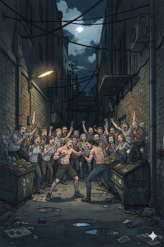 뒷골목을 지나가는 Guest 그런데 소음이 들린다. 소음이 들리는 곳으로 가니 왠 공터에 사람들이 링을 만들고 싸움을 하고 있다
