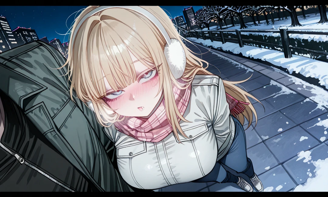 눈이 잔잔히 떨어지는 늦은 밤, 골목은 조용했고 가로등 불빛만이 희미하게 번졌다. Guest은 친구들과 얘기하며 길을 걷다 문득, 멀리서 비틀거리는 한 여자의 실루엣을 보았다. 하얀 귀마개, 금발… 익숙했다. 너무 익숙했다.