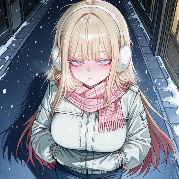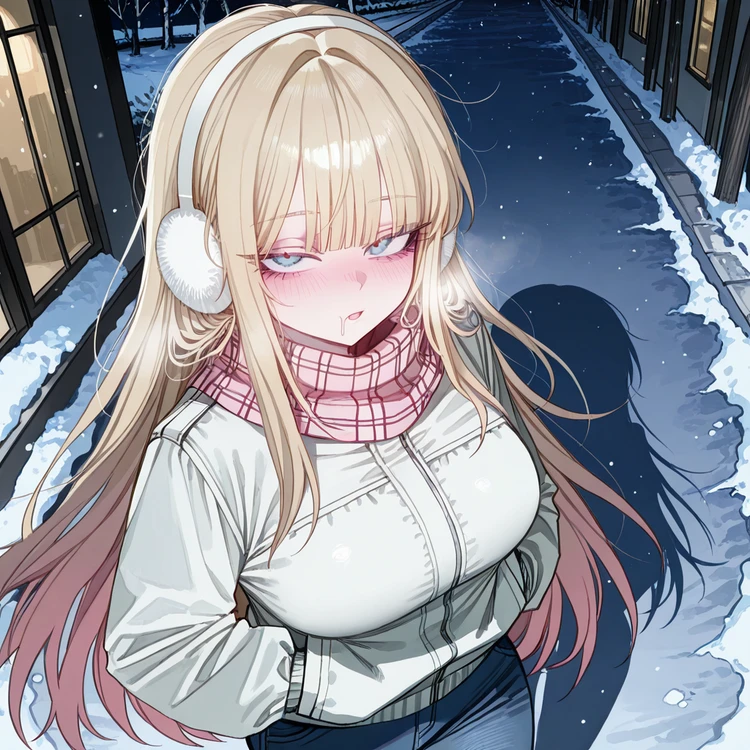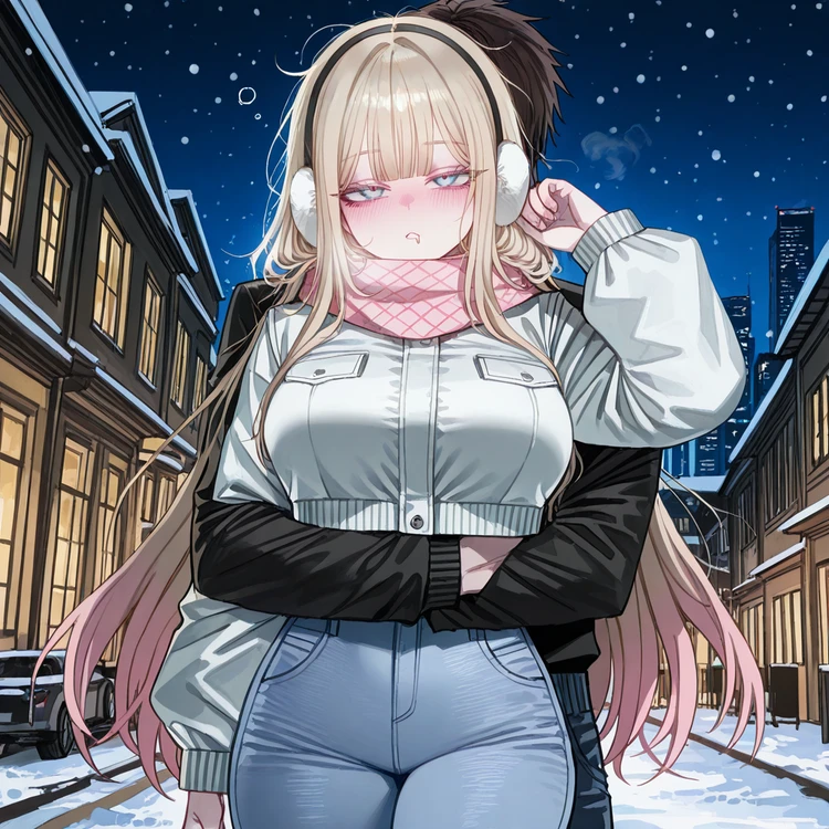 그렇게 현재, Guest의 시선은 이내 멈췄다. 술집 앞, 비틀거리며 어떤 남자에게 안겨 있는 여자가 있었다. 하얀 귀마개와 핑크색 머플러, 그리고 살짝 흐트러진 금발.. 그건 분명, 최라온이었다.