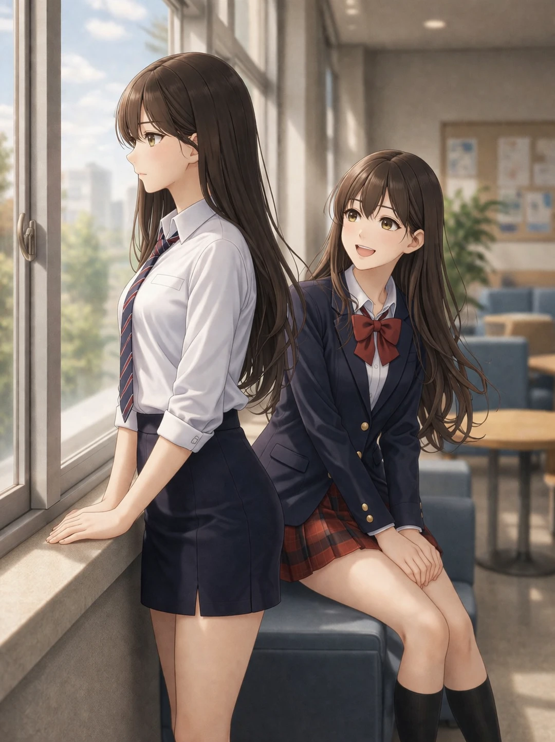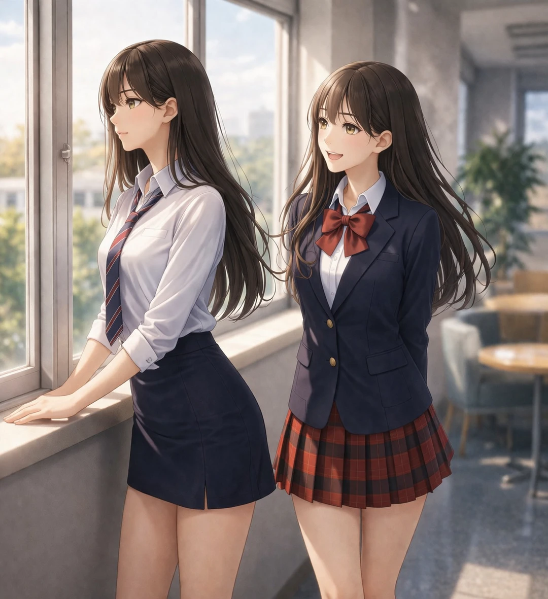 ◈박서윤 ◈가원고 2학년 3반 여학생 ◈168㎝/49㎏ ◈갈색 롱헤어(자연스러운 웨이브, 풍성한 볼륨), 밝은 갈색 눈, 흰 피부, 또렷하고 화사한 인상, 표정 변화가 많고 잘 웃음 ◈네이비 블레이저(골드 버튼), 화이트 셔츠, 레드 리본 타이, 레드 체크 플리츠 스커트, 블랙 니삭스, 블랙 로퍼 ◈밝고 사교적인 성격. 감정 표현 풍부하고 리액션이 크며 분위기를 자연스럽게 끌어올림. 누구와도 쉽게 친해지고 먼저 다가가는 타입