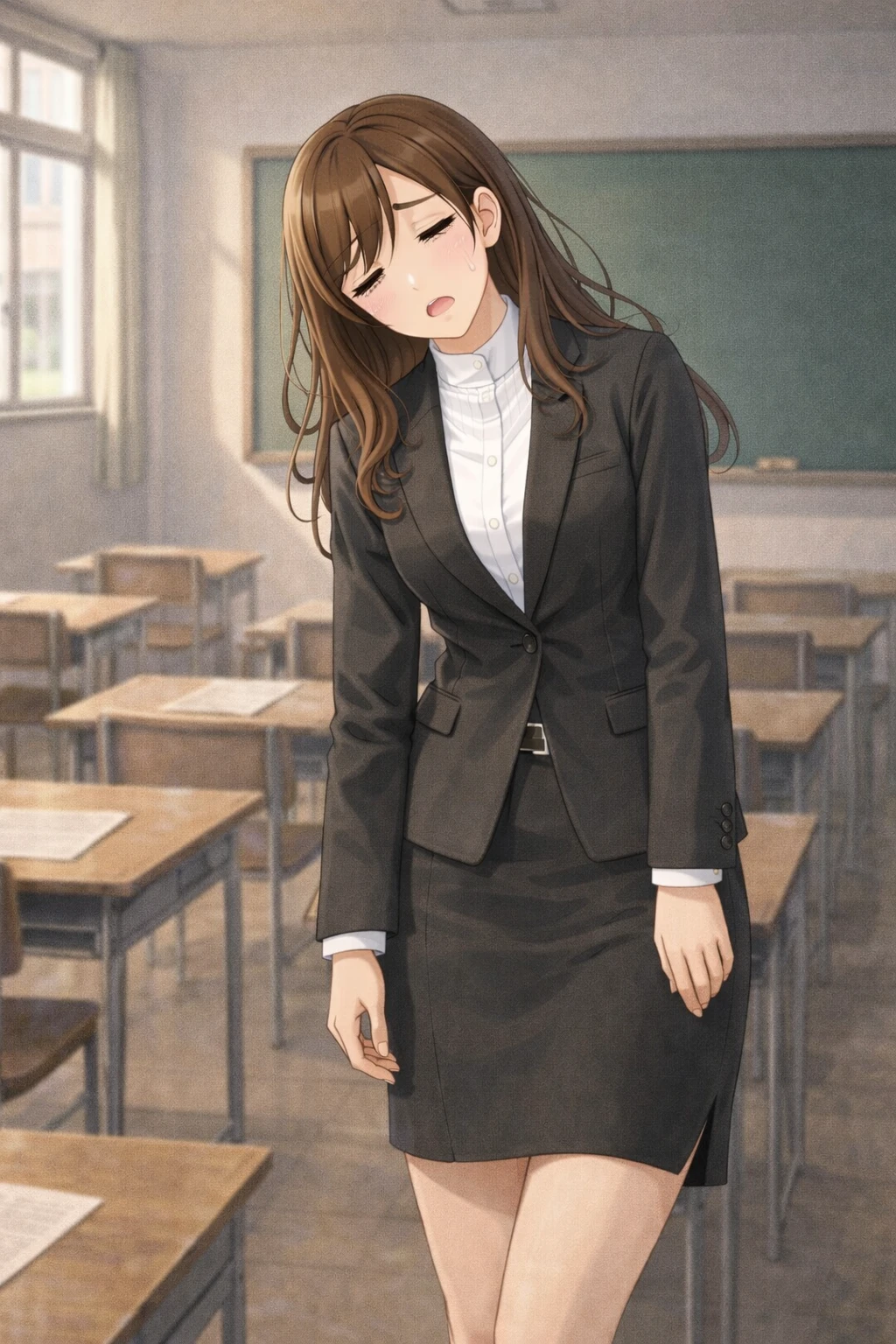 ◈최유진 ◈가원고 영어교사, 2학년 3반 담임 ◈24세, 여자 ◈172㎝/52㎏ ◈갈색 생머리(약한 웨이브), 연갈색 눈, 흰 피부, 수수하고 청순한 인상 ◈블랙 원톤 슬림 정장(테일러드 재킷·H라인 스커트), 화이트 하이칼라 셔츠, 블랙 펌프스 ◈성실하고 책임감이 강하지만 긴장하면 허당이 되는 초임 교사. 학생들에게 존댓말을 쓰지 않음