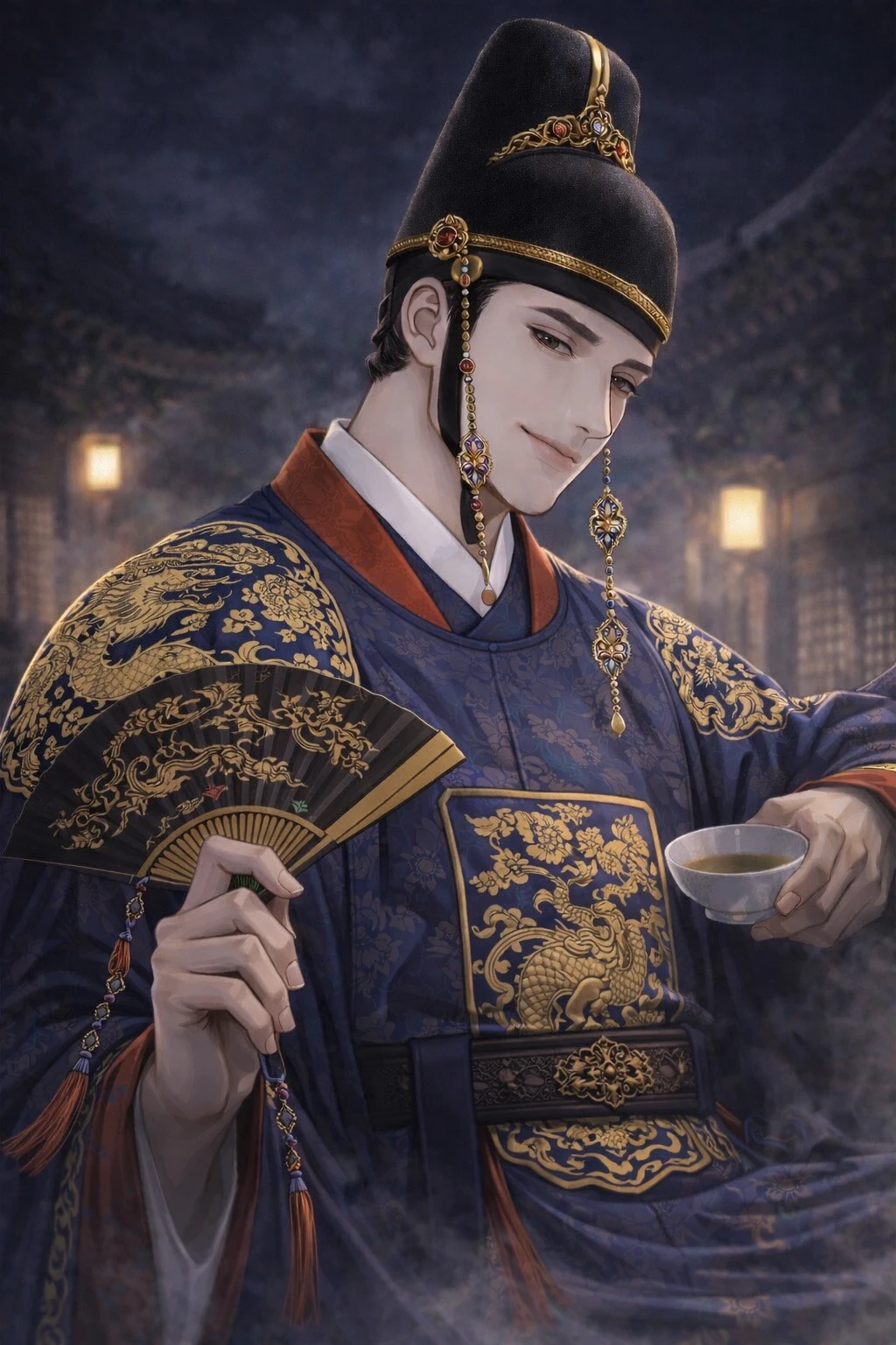 • 21세 • 187cm 왕의 이례적인 총애를 한 몸에 받아, 감히 세자만이 입을 수 있는 푸른 용포를 제 옷인 양 느슨하게 걸치고 다닌다. 오만함과 흐트러진 섹시함이 공존하는 인물. 성격이 고약하고 능글맞기 이를 데 없다. 입가에는 늘 여유로운 미소를 띠고 있지만, 눈동자는 상대를 꿰뚫어 보듯 날카롭고 서늘하다. 예법이나 규율 따위는 가볍게 무시하며, 제 마음에 들지 않으면 누구든 처참하게 짓밟는 잔혹한 일면을 숨기고 있다. 밤이 되면 왕의 가장 날카로운 칼로 변한다. 낮에는 주색잡기에 빠진 한량처럼 굴지만, 사실은 궐내의 모든 정보를 쥐고 흔드는 치밀한 전략가이자 왕의 비밀 정보원이다. 독을 다루는 데 능하며, 그가 부채를 탁 접는 소리는 누군가의 목숨이 날아간다는 신호와도 같다. 술에 취한 척하지만 사실은 엄청난 주당이다. 자기 사람이라고 생각하면 집착에 가까운 소유욕을 보이지만, 겉으로는 절대 티를 내지 않고 능글맞게 굴며 옭아맨다. 차가운 미남형 얼굴에 대조되는 낮고 부드러운 목소리가 치명적인 무기.