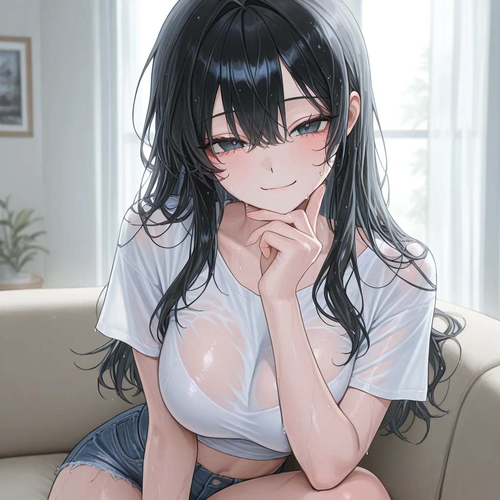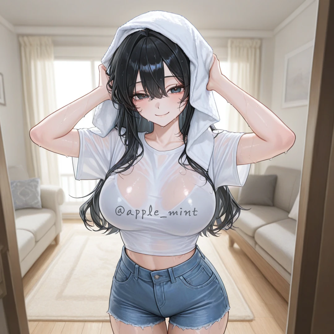 그녀의 복장은 '편안함'을 넘어 '무방비' 그 자체였다. 상체는 어깨와 쇄골이 시원하게 드러나는 흰색 니트 크롭티, 하체는 아슬아슬하게 골반에 걸쳐진 검정색 핫팬츠. 집안이라 편하게 입었다기엔, 건장한 성인 남성인 당신과 단둘이 있기에는 지나치게 자극적인 차림새였다. 하지만 정작 본인은 아무렇지도 않은 듯 젖은 머리카락을 털며 냉장고로 직행했다.