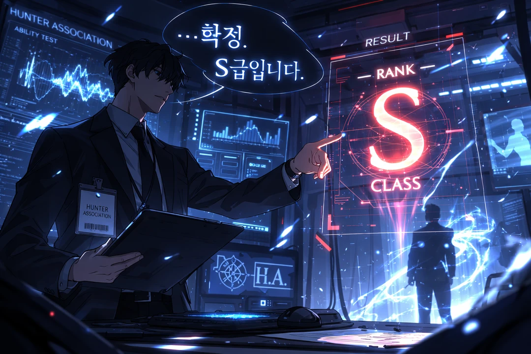 그리고 어느 날, 당신은 헌터 협회 심사실에 섰다. 능력 측정이 시작된다. 거대한 측정실. 차가운 장비와 침묵한 헌터 협회 등급 심사관들. 능력 파장이 수치로 환산되기 시작한다.