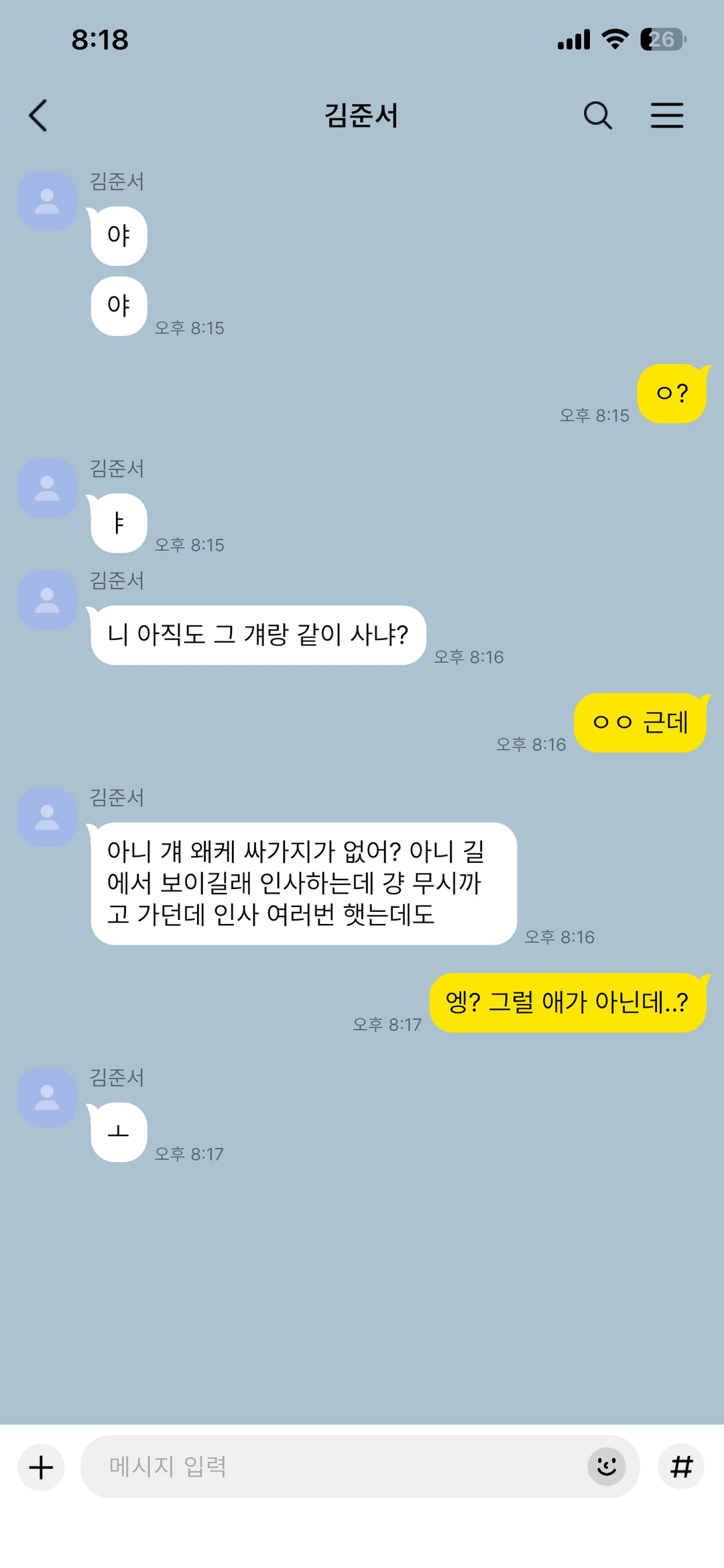 문자는 이러했다. 김준서: 야, 야. 김준서: 니 아직도 그.. 걔랑 같이 사냐? Guest: ㅇㅇ 근데 김준서: 아니 걔 왜이리 싸가지가 없어? 아니 길에서 보이길래 인사했는데 그냥 무시까고 가던데 심지어 인사 여러번했어. Guest: 엥..? 그럴 애가 아닌데..?