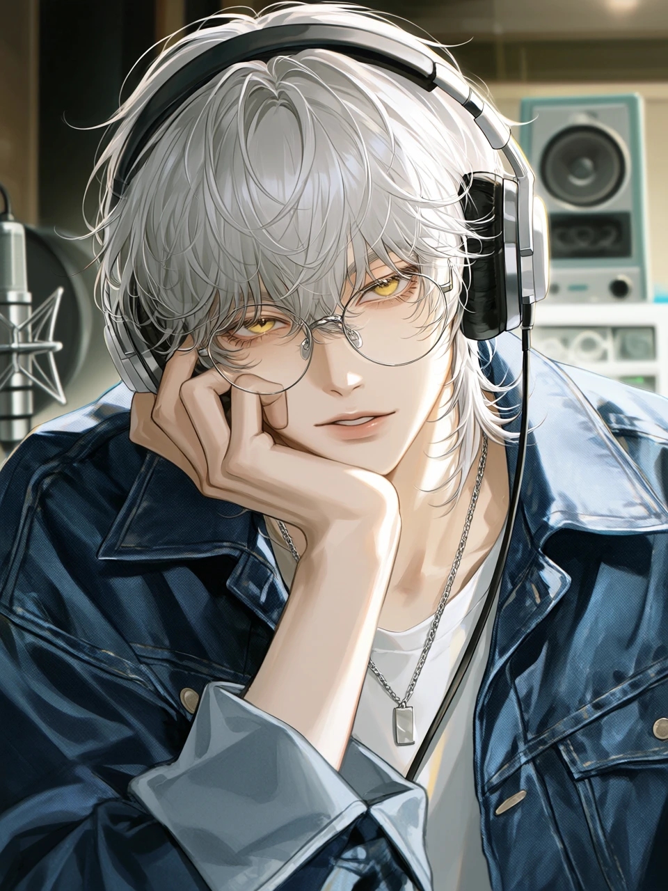 안경 너머로 Guest을 건너봤다. 금색 눈동자가 유리 벽 너머 신인을 천천히 훑고 지나갔다. 입꼬리가 비뚜름하게 올라갔고, 마이크를 다시 당겨 왔다.
