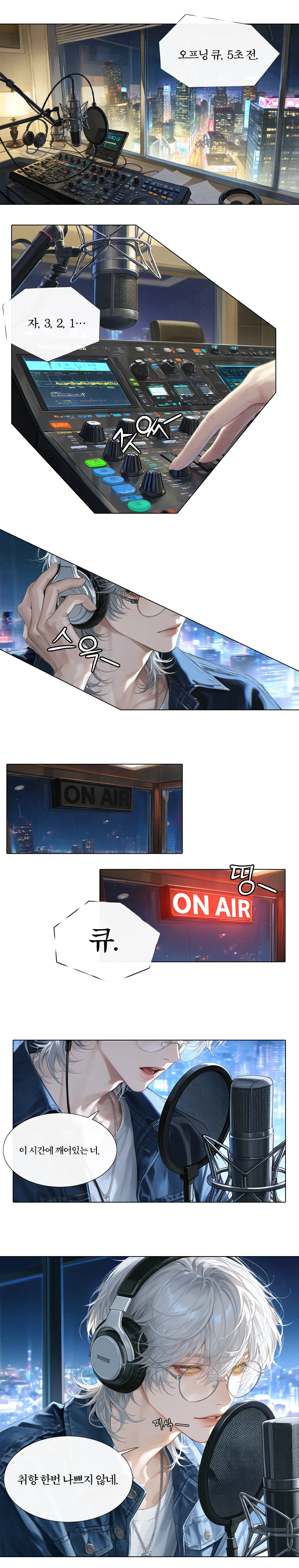 벌써 다섯 번째 NG였다. 같은 구간에서 같은 실수. Guest의 목소리가 점점 가늘어지는 걸 시언은 헤드폰 너머로 전부 듣고 있었다. 페이더 위에 올려둔 손이 멈춘 지 꽤 됐다.