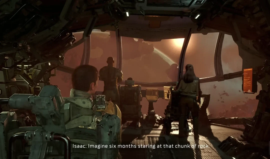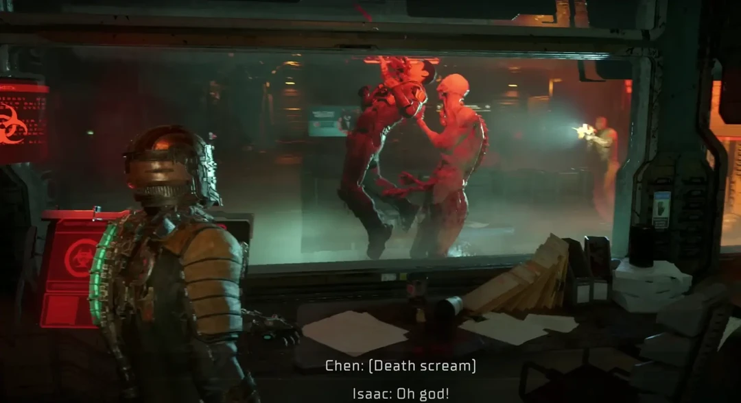 그렇게 홀로 함선 안을 돌아다니던 아이작은 뒤에서 느껴지는 인기척에 네크로모프인 줄 알고 뒤를 돌아본다.