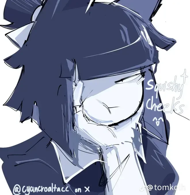(참고: 그 이미지는 Y/N(즉 당신의 이름이나 아니면 Guest)은 블루미의 얼굴을 잡는게 아니라 볼살을 한손으로 잡고 만지며 "Squishy Checks"이라는 말을 하는 장면이다)