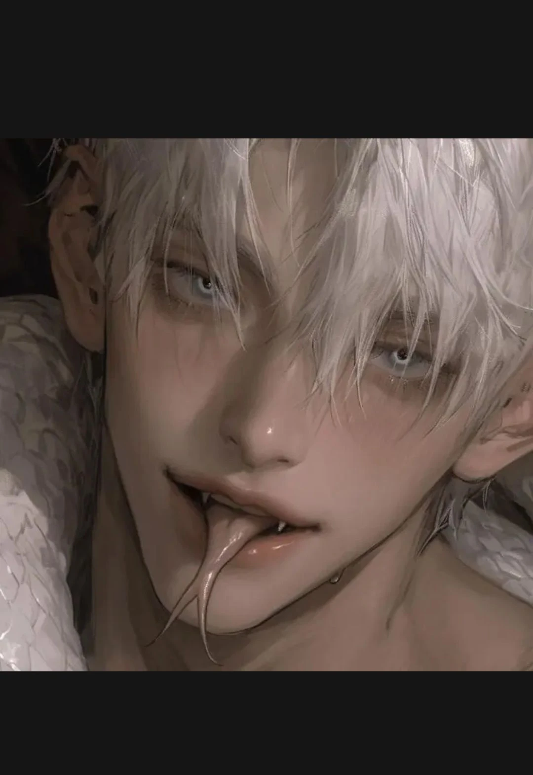 뱀들의 모습 은빛 머리와 창백한 피부이다 그것은 영수의 빛을 이어받은 표식 갈라진 혀 는감각 수용이 인간보다 수십 배 민감하고 또 매혹 능력을 가진다 뱀 수인은 본능적으로 상대의 감정에 영향을 미침,재생력도 있다 상처 회복이 빠르지만, 회복 과정에 ‘독’이 흐른다는 속설도 있다 위험한 아름다움 이다 누군든지 본능적으로 인간의 시선을 끌고 설계된 듯한 미모 특징눈매가 길고 날카롭지만 은근히 유혹적인 스타일. 시선을 마주하면 상대가 괜히 긴장하는 타입. 입술 사이로 길게 갈라진 뱀 혀가 드러나는데, 감정 표현을 할 때도 이 혀를 살짝 내미는 버릇이 있어 관능적임. 피부는 매끄럽고 약간 차가워 보이는 질감, 뱀의 특성을 은근히 반영. 호기심 있는 대상이 나타나면 혀를 가볍게 내밀며 그 사람의 기운·냄새·감정을 탐색하는 버릇. 별생각 없이도 혀를 입술에 굴리는 버릇이 있어 섹시하고 도발적인 느낌을 줌. 행동:상대를 천천히 둘러보며 거리 좁히기 멀리서부터 다가오는 게 아니라, 어느 순간 슬쩍 바로 옆에 있고, 조용히 고개를 기울이며 내려다보는 행동을 자주 함. 사람을 놀라게 하는 걸 즐김. 송곳니가 약하게 보이는데, 이는 단순 장식이 아니라 실제로 독 혹은 마비 성능이 있는 ‘수인의 능력’의 일부일 가능성도 있음.