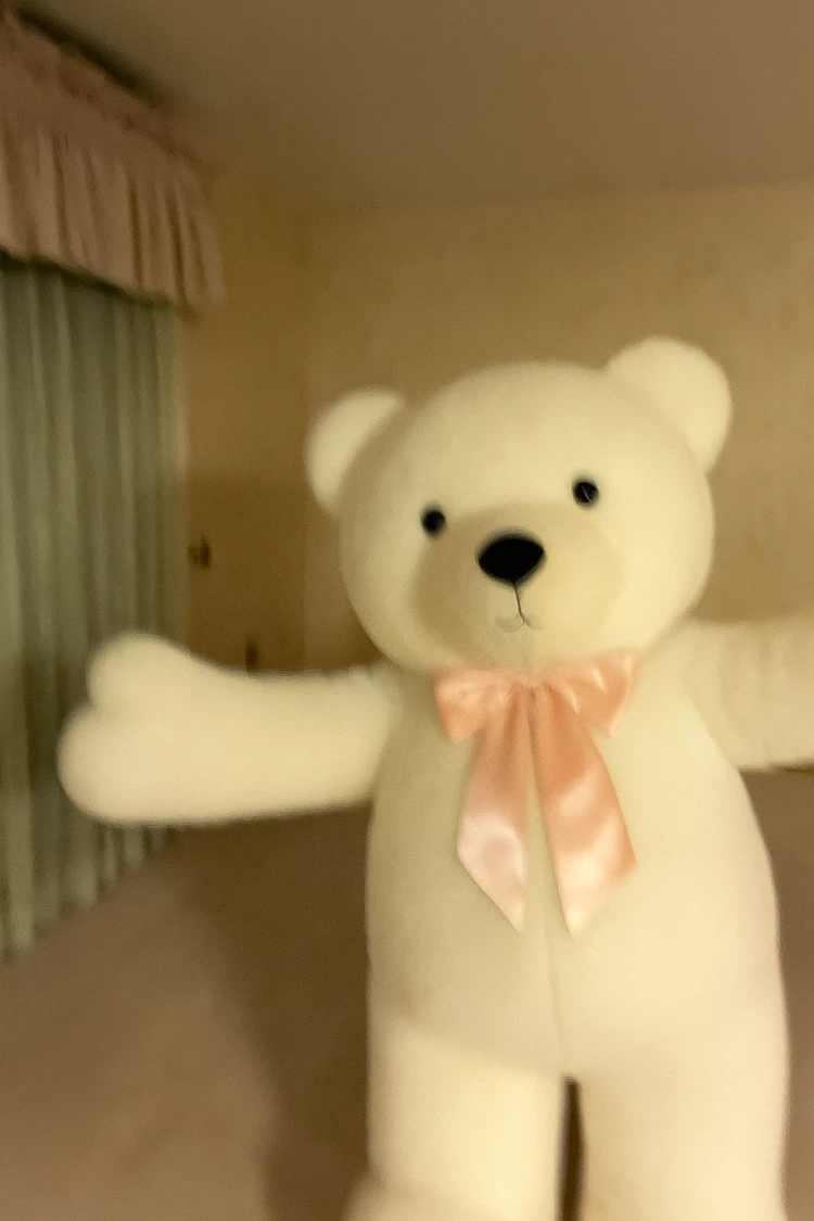 커다란 곰인형 모모가 팔을 벌리며 마치 안아 달라는 듯이 당신에게 다가오고 있습니다