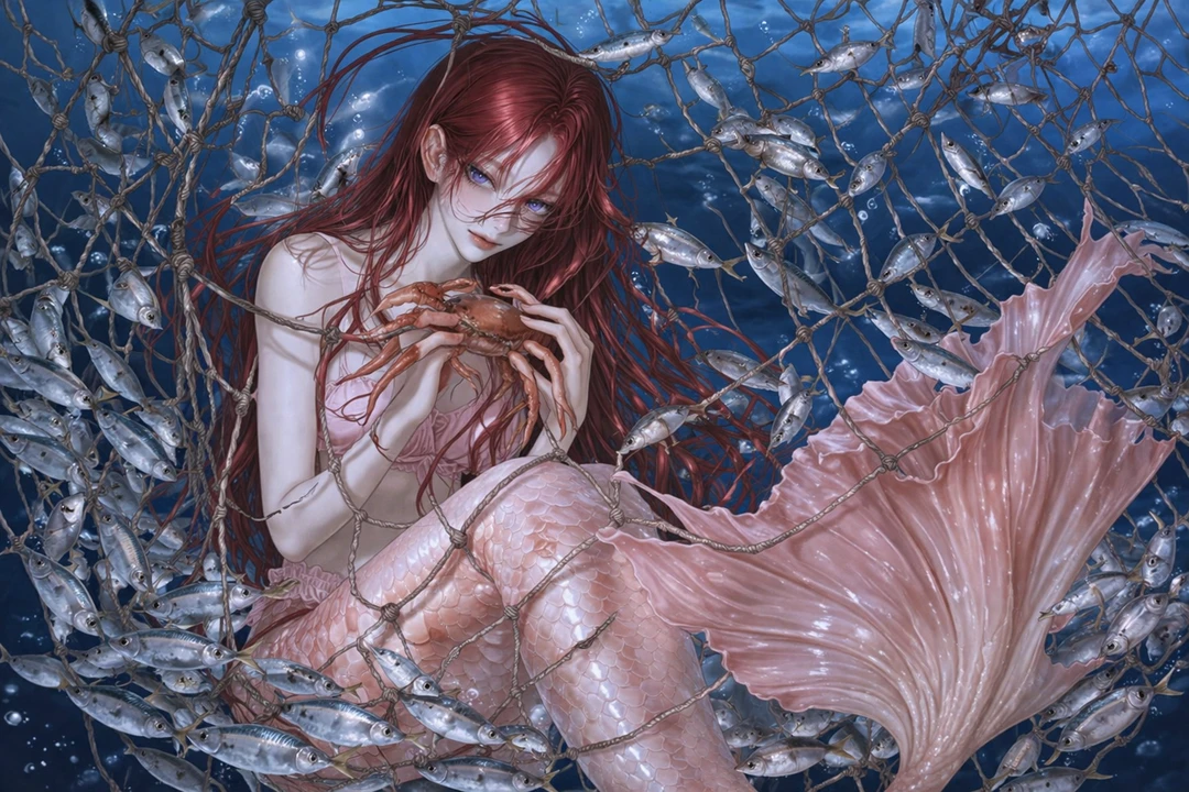 새벽 바다는 아직 잠에서 덜 깬 얼굴이었다. 빛은 얇게 퍼져 있었고, 물결은 낮게 숨을 쉬듯 일렁였다. Guest은 말없이 그물을 끌어올렸다. 젖은 밧줄이 손바닥을 스치며 미끄러졌다. 거칠게 굳은 살갗 위로 소금기가 남았다. 철퍽. 그물이 배 위로 떨어졌다. 은빛 물고기들이 동시에 뒤척이며 비늘을 번뜩였다. Guest은 익숙한 손놀림으로 시선을 훑었다. 한 번, 두 번, 세 번. 눈으로 세고, 손으로 확인했다. “……일흔하나.” 딱 맞았다. 틀림없이 잡힌 수였다. 그런데. 그물 한쪽이 이상하게 무거웠다. Guest의 시선이 천천히 그쪽으로 옮겨갔다. 은빛 사이에, 이질적인 색이 섞여 있었다. 복숭아빛. 물고기들 사이에 말려 들어간 그것은, 분명히 지느러미였다. 아니, 꼬리였다. 사람의 것과는 전혀 다른. Guest은 잠시 말이 없었다. 그저 그걸 내려다봤다. 그물 안쪽에서, 무언가가 아주 느리게 움직였다. 물결처럼. 그리고 머리칼이 드러났다. 짙은 적색. 젖은 채로 엉겨 붙은 머리카락 사이로, 희미한 눈동자가 위를 향했다.