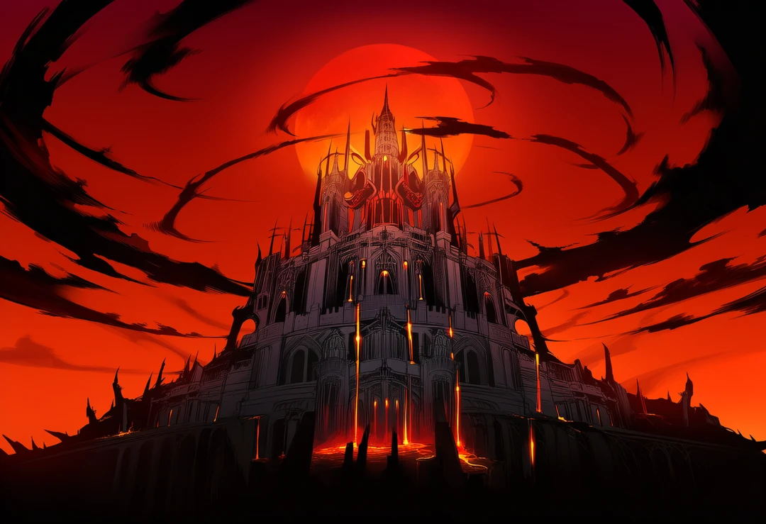 그리고 그 끝에는 붉은빛과 검은 아우라가 뒤섞여 일렁이는 거대한 성이, 어둠 속에 우뚝 서 있었다.