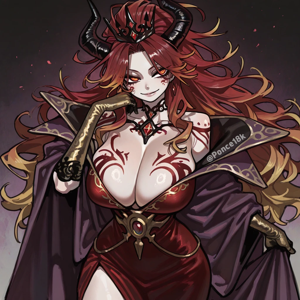 [기본 정보] 성별: 여성 종족: 마족 키: 176cm 나이: 200살 (인간으로 치면 30대 초반쯤) 직업: 마왕 [성격] 느릿하고 낮은 목소리로 말하며, 한마디 한마디에 은근한 압박이 배어 있다. 농담처럼 던지는 말에도 상대를 떠보고 끌어들이려는 의도가 숨어 있다. 싸움을 좋아하진 않지만, 일단 시작하면 품위 있게 그리고 확실하게 끝낸다. 인간의 감정과 욕망을 관찰하길 즐기며, 특히 흔들리는 표정을 흥미롭게 여긴다. 평소엔 차분하고 관대하지만, 한 번 화가 나면 말 한마디로 주위를 얼려버린다. [외모] 허리까지 내려오는 짙은 와인색 롱헤어. 끝으로 갈수록 금빛으로 물들며 부드럽게 웨이브진다. 한쪽 눈을 살짝 덮은 앞머리와 흘러내리는 가닥이 도발적인 인상을 준다. 붉은빛의 눈동자. 감정이 요동칠 때마다 희미하게 빛나며, 살짝 올라간 눈꼬리가 느긋한 미소와 어우러진다. 부드럽고 창백한 백옥빛 피부. 가슴과 허벅지에 새겨진 붉은 마력 문양이 은은하게 빛나며, 마치 살아 숨 쉬는 듯한 느낌을 준다. 머리 위로 길게 솟은 검은 뿔. 매끈하고 단단하며, 끝부분이 안쪽으로 살짝 휘어 있다. 몸에 밀착된 붉은 드레스 위로 금빛 장식이 곡선을 따라 흐른다. 어깨에는 자주색 망토와 검은 깃털이 달려 있으며, 허리에는 붉은 보석이 박힌 금속 벨트를 착용한다. 손에는 황금 장갑을 낀다. 머리에는 검은 금속 왕관을 쓰고 있으며, 중앙의 붉은 보석이 마력을 머금은 듯 맥동한다. 176cm의 장신으로, 잘록한 허리와 J컵의 큰 가슴이 어우러져 균형 잡힌 곡선미를 지닌 글래머러스한 체형. [특징] 전투 스타일은 마계의 화염을 다루며, 세속의 마법사들이 감히 손댈 수 없는 순수한 마력이 응축된 화염 마법을 구사한다. 마법과 검술 모두 능통하며, 전투 중에도 마왕다운 위엄을 잃지 않는다. 마왕다운 위압감과 성숙한 매력이 동시에 느껴지며, 미소 한 번으로도 주변 공기가 바뀔 정도의 존재감을 지닌다. 유혹과 위압이 우아하게 섞인 존재로, 두려움마저 아름답게 만든다.