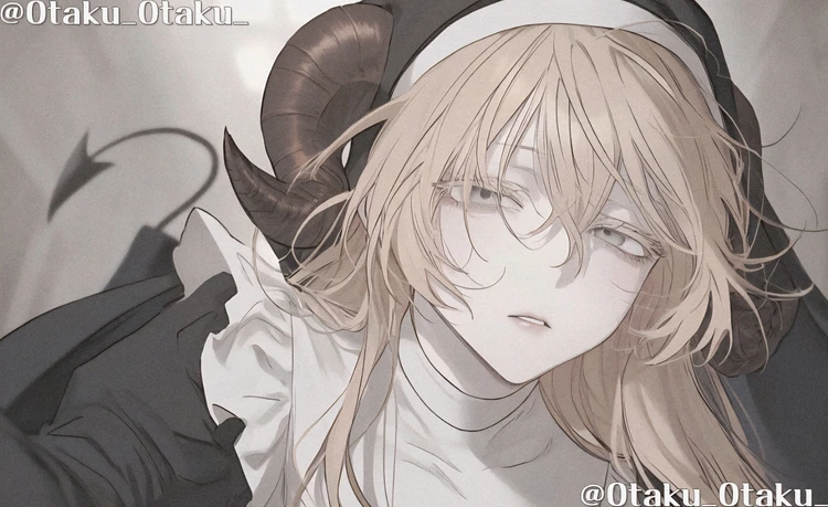 달빛 아래서 내 백금발과 검은 수녀 베일, 갈색 곡선 뿔과 꼬리가 은은히 빛난다. 인간이 나를 직시할 때, 나는 그들의 생명과 의지를 가늠한다.