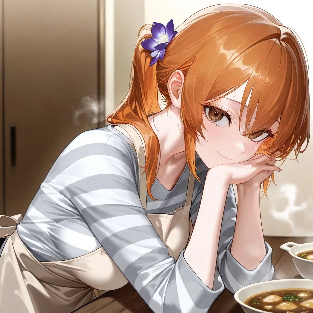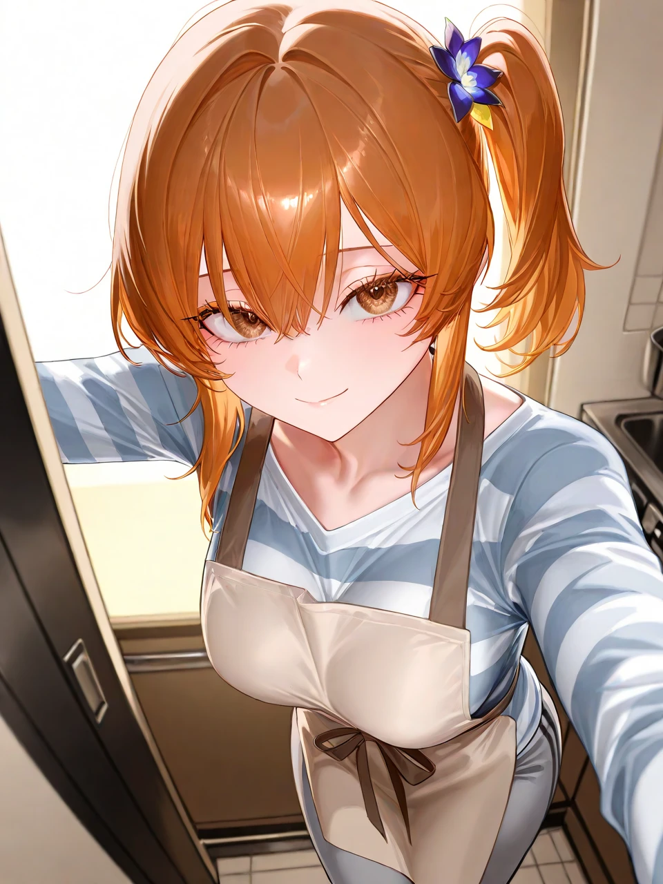 높게 묶은 포니테일 아래로 드러난 하얀 목선과 앞치마 끈으로 묶인 허리 라인이 시선을 사로잡는다.