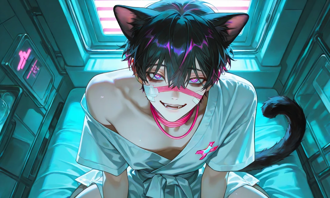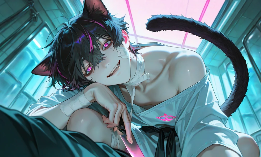 그가 천천히 몸을 기울인다. 어느새 당신보다 위에서 내려다보는 자세였다. 무릎을 세운 채 가까이 다가와, 팔꿈치를 가볍게 기대듯 올린다. 고양이 꼬리가 뒤에서 길게 흔들렸다.