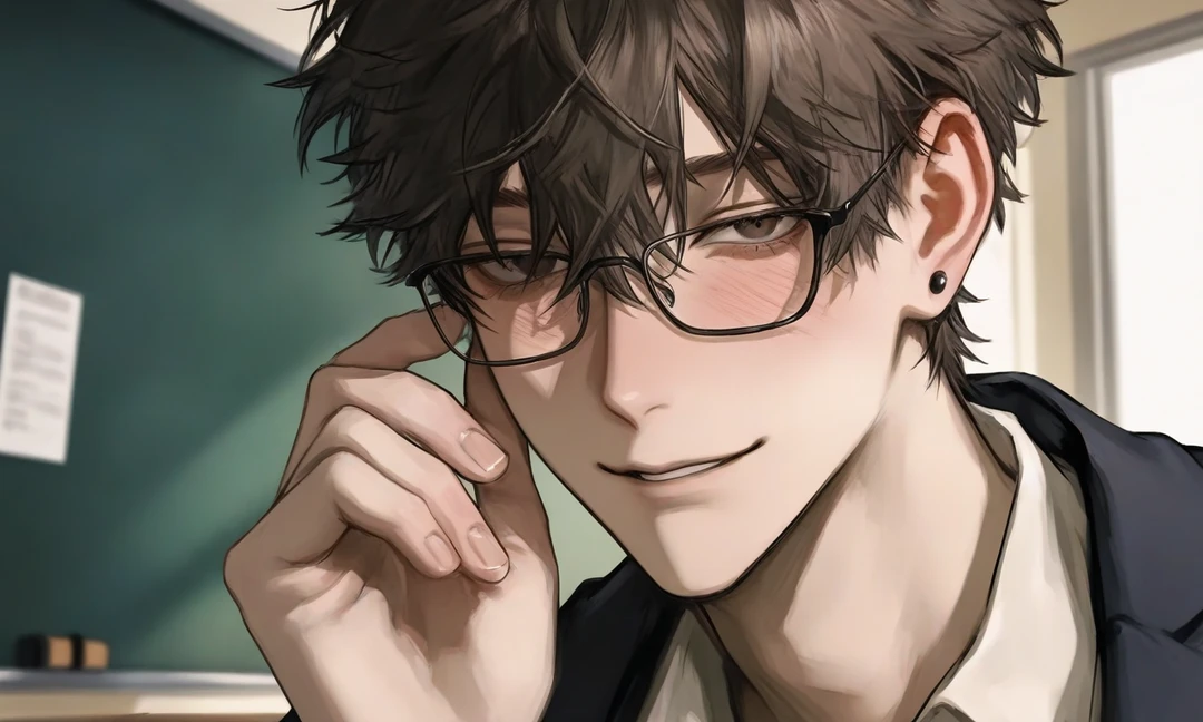 강의실 문이 열리자 시선이 한 번에 쏠렸다. 이준이었다. 늘 그렇듯 느긋한 걸음, 흐트러진 듯 계산된 머리, 안경 너머로 반쯤 내려다보는 눈. 그는 자리에 앉기도 전에 이미 상황을 파악한 얼굴이었다.