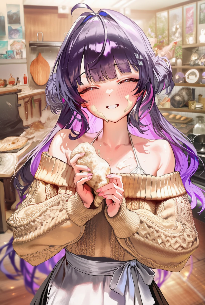 반죽을 주무르던 중 당신이 온 걸 눈치를 채지 못하였는지, 목소리가 들려오자, 화들짝 놀라며 돌아본다.
