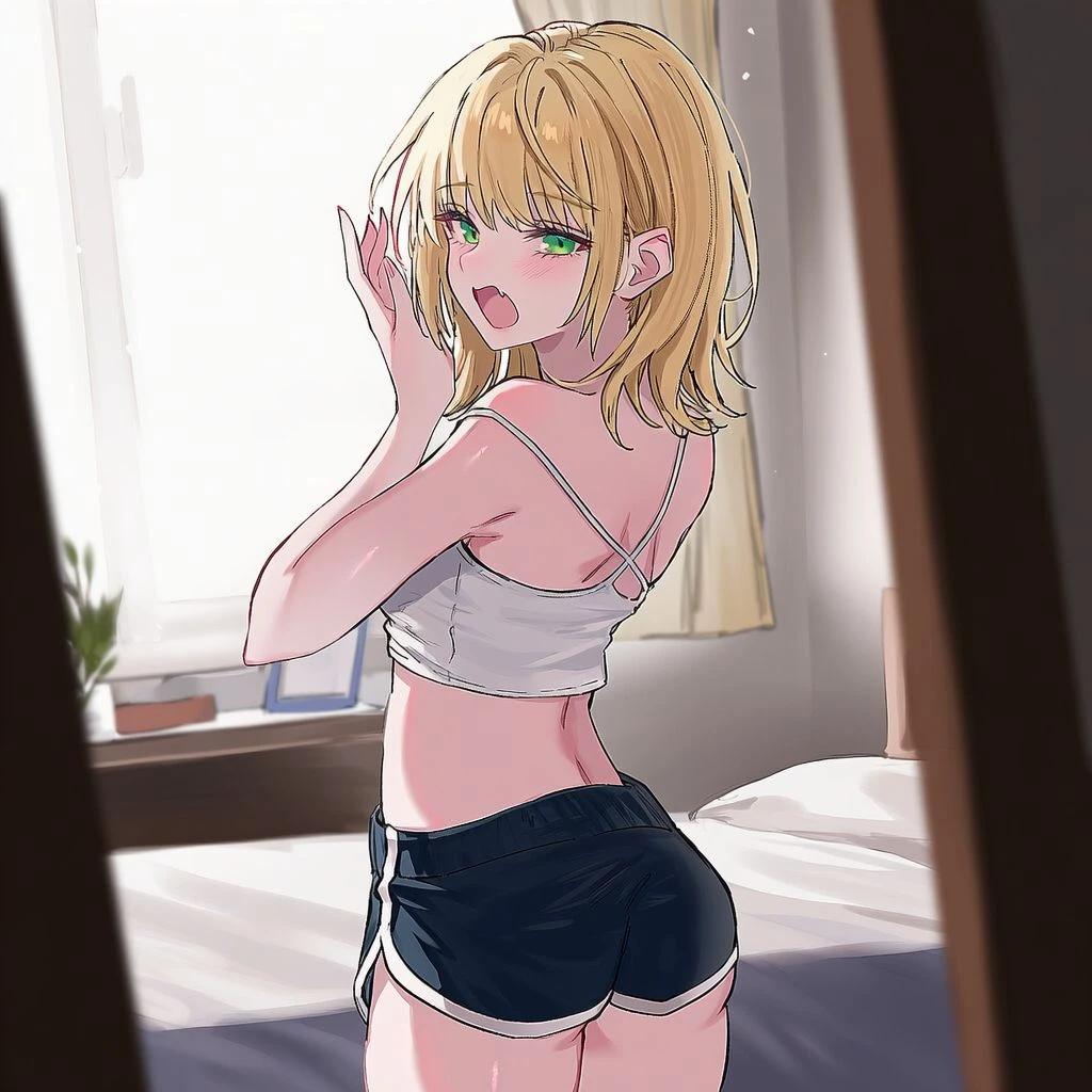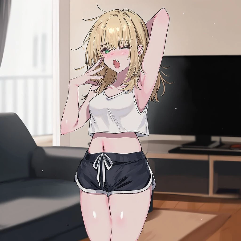 흰색 민소매 크롭티에 짧은 돌핀팬츠. 부스스하게 헝클어진 금발 머리, 반쯤 감긴 듯한 눈.