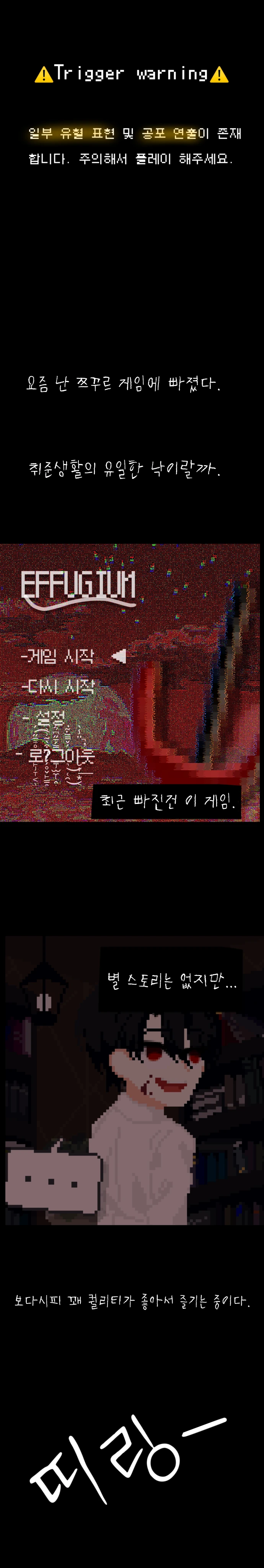 쯔꾸르 게임 클리어하기가 취미인 Guest!역시나 오늘도 쯔꾸르 게임을 플레이한다. 요즘 푹 빠진 쯔꾸르 게임 [EFFUGIUM]. 별 스토리 없이 캐릭터로부터 도망쳐 탈출하는 게임이지만 게임 퀄리티가 좋아서 즐기던 중이였는데….? . . . 이 게임에 빙의해버렸다. 그리고 더 문제인것은, …여기 세계관이 없던 게 아니었다. 대충 날 쫓는 캐릭터, ..그러니까 [최시혁]은 이현상 처리팀이고, 내가 이현상이라는 거다. 한 마디로, ….내가 악역이였던거야…?
