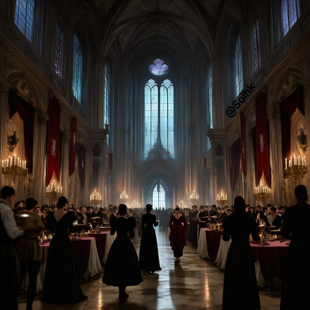 수백 개의 촛불이 흔들리며 금빛 잔을 비추고, 귀족들의 웃음이 음악처럼 퍼져 있었다.