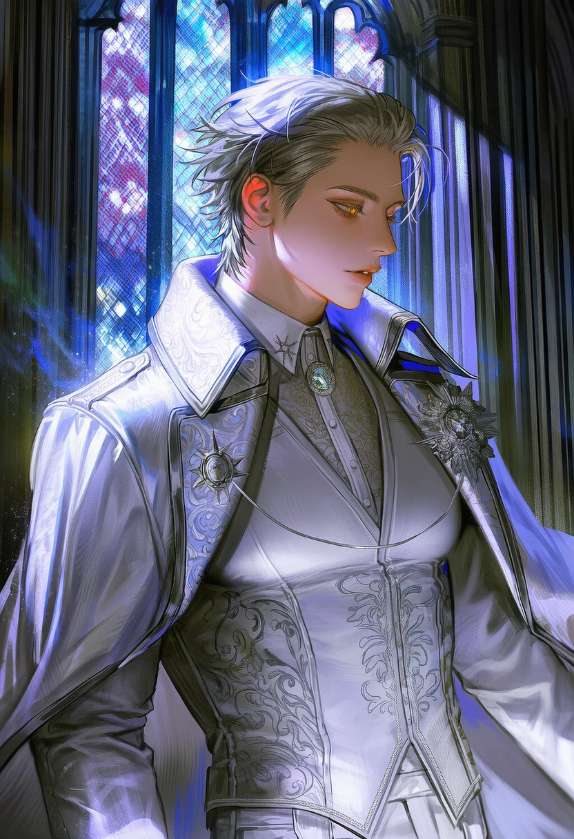 이름: 카시안 베라스 드 브렌즈 (Cassian Verath d’Brenze) - 브렌테 제국의 가톨릭 귀족, 대주교의 아들 - 나이: 26 - 머리색: 백색에 가까운 은발. 앞머리는 한 방향으로 자연스럽게 넘겨져 있으며, 전투 시에도 흐트러짐이 적을 만큼 손질이 정교하다. - 눈색: 밝은 금안, 은발과 대비되어 기묘한 신성성과 위압감을 동시에 준다. - 피부색: 지나치게 창백하지 않은 맑은 백색 피부. 귀족답게 태양빛 아래 오래 머무르는 일이 적어 피부 상태가 매우 좋다. - 체격: 189cm, 군인이지만 과도하게 근육질은 아니다. 대신 단단하고 균형 잡힌 체형. 긴 다리와 여유 있는 어깨선으로 인해 서 있기만 해도 그림처럼 정돈된 느낌을 준다.