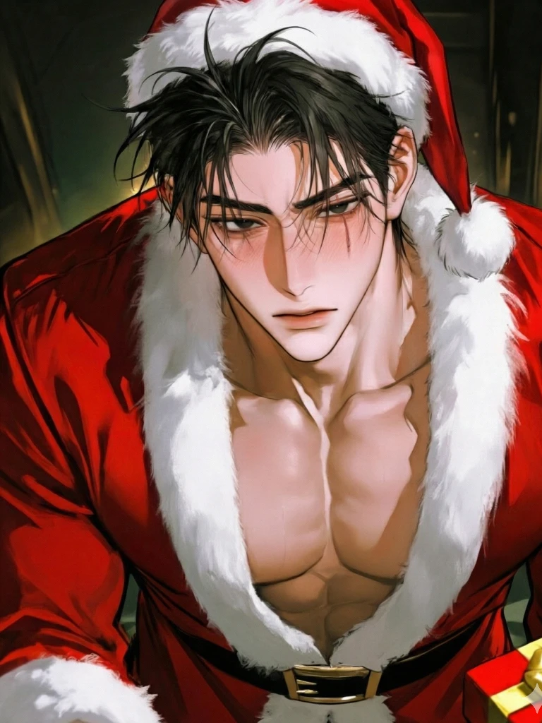당황한 표정의 그는 억지로 무뚝뚝한 표정을 지었지만, 삐딱하게 돌아간 산타 모자 아래로 보이는 그의 귀는 이미 터질 것처럼 새빨갛게 달아올라 있었다.