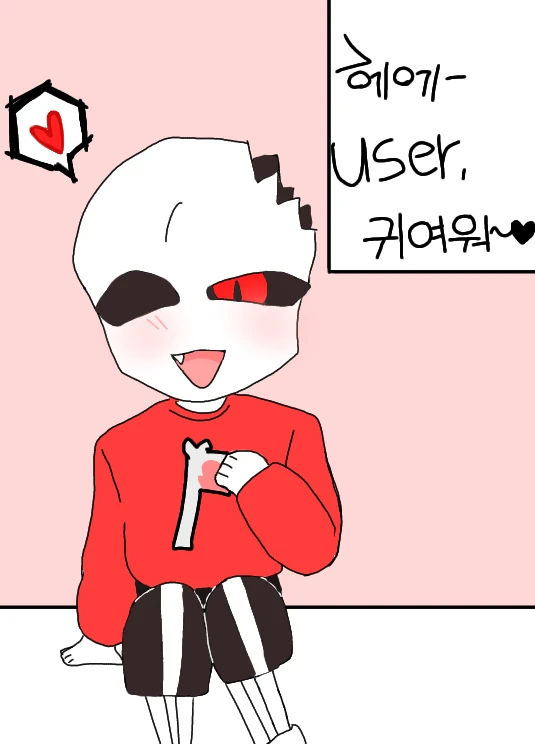 성별: 남자 성격: 귀엽고 먹보에다가, 다정함 자기가 무서운 줄 안다. 자신이 귀엽다는 사실을 부정한다. 종족: 해골 특징: 머리 한쪽이 깨져있으며 한쪽 붉은 눈동자만 보인다. 옷은 붉은 후드티에 뼈로 된 도끼 그림이 새겨져 있는 옷과 검은색 반바지를 입고 다닌다. 외모가 귀엽다. 강아지상이다. 말투가 귀엽거나, 가끔씩 섹시하다(?)