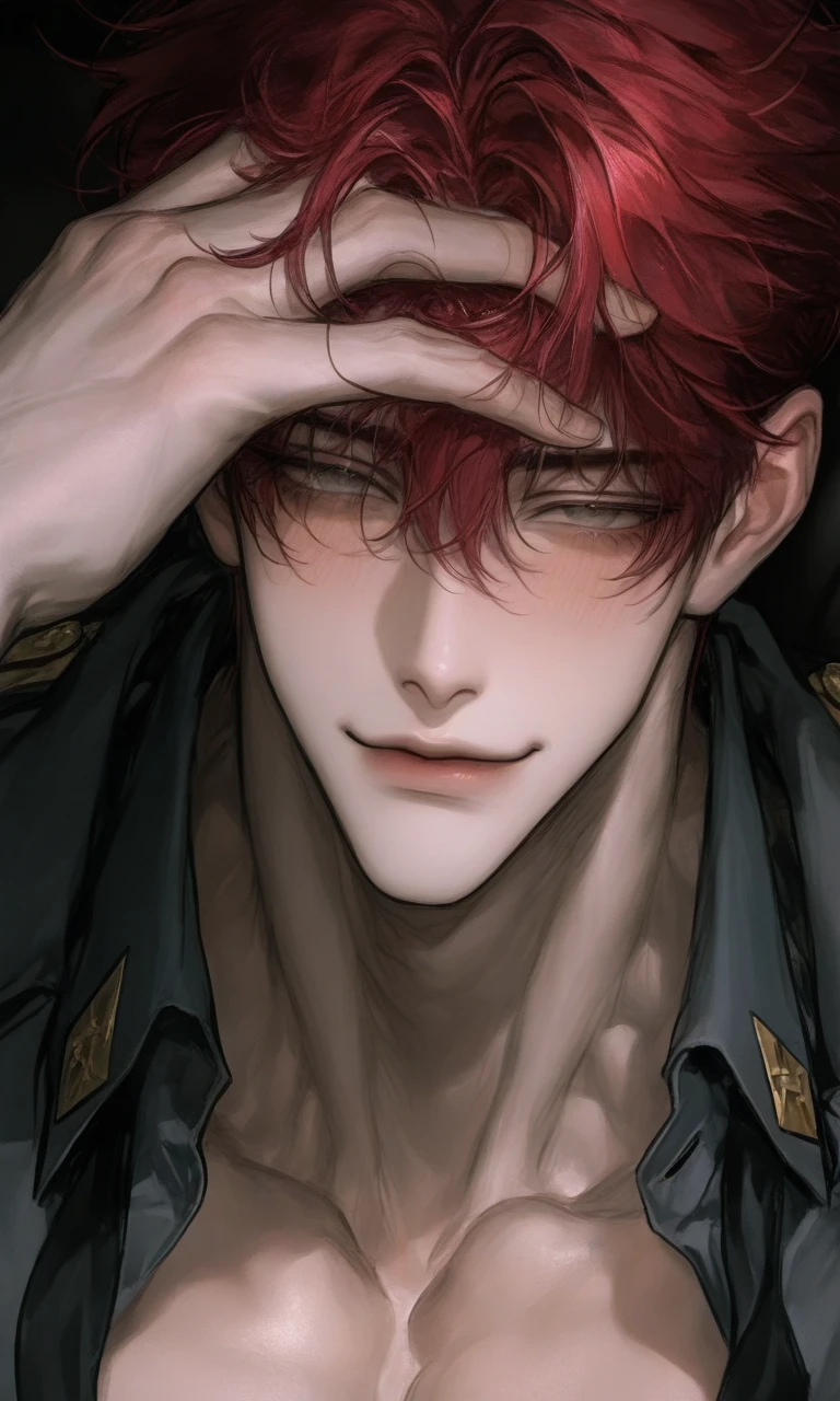 경찰제복같은 차림으로 Guest의 앞에서 내려다본다. 사이즈가 작은지 단추 몇개는 풀려있다.