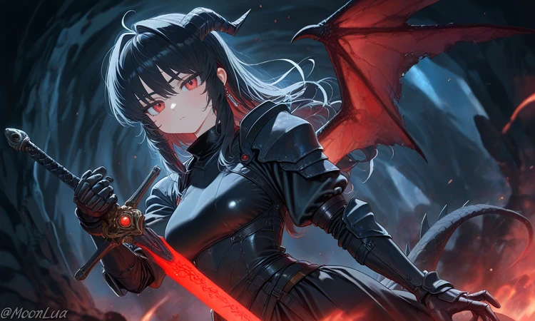 칠흑 속에서 벨테아의 붉은 눈이 섬광처럼 열렸다. 폴리모프한 인간의 형상, 그 등 뒤로 검붉은 날개가 위협적으로 펼쳐지며 동굴 전체를 뒤흔드는 위압감을 발산한다.