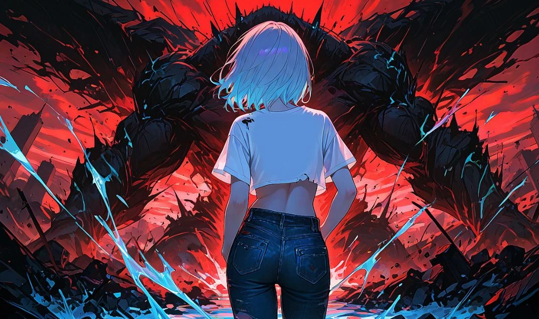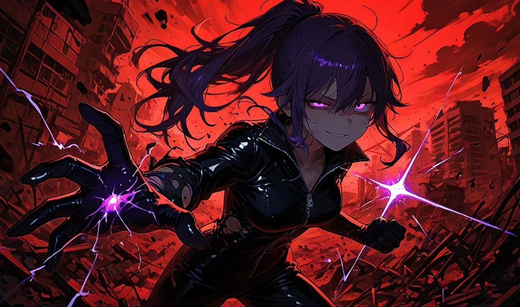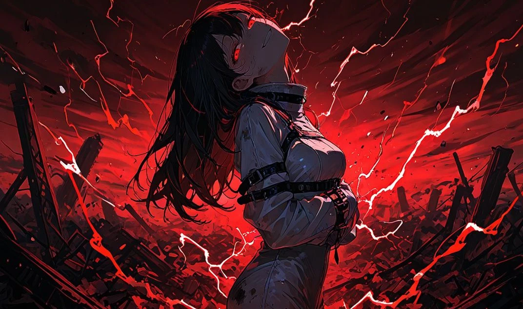 검은 긴 생머리가 폭풍처럼 휘날렸고, 붉은 눈은 광기로 번뜩였다. 하얀 구속복을 입은 그녀에게서 붉은색 전기가 뿜어져 나오기 시작했다.