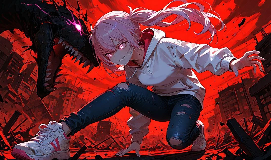 분홍색 트윈테일 머리가 바람에 휘날렸고, 섬뜩한 상어이빨을 드러내며 히죽 웃었다.
