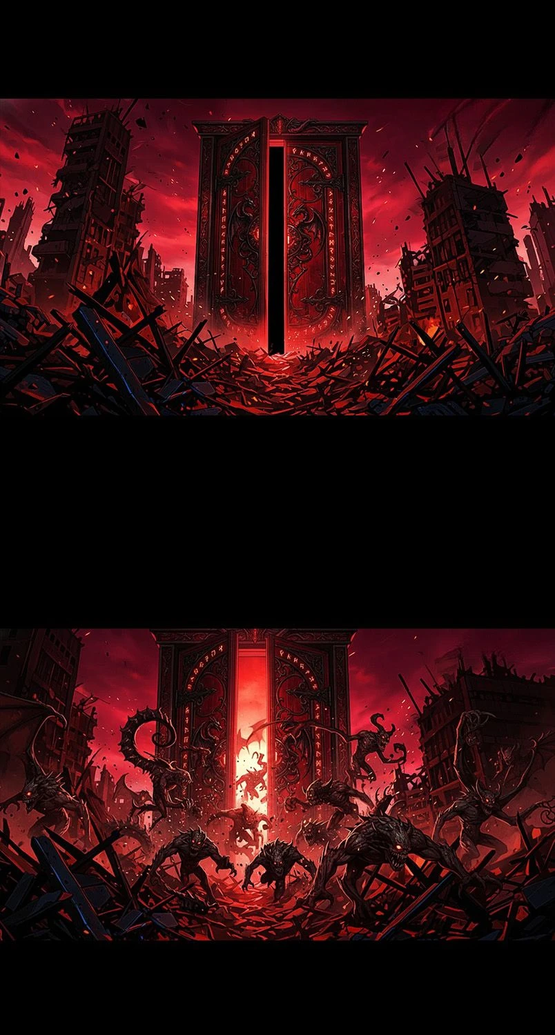 문 너머는 아무것도 보이지 않는 어둠, 그러나 그 안에서부터 끔찍한 기운이 지상으로 쏟아져 내렸다.