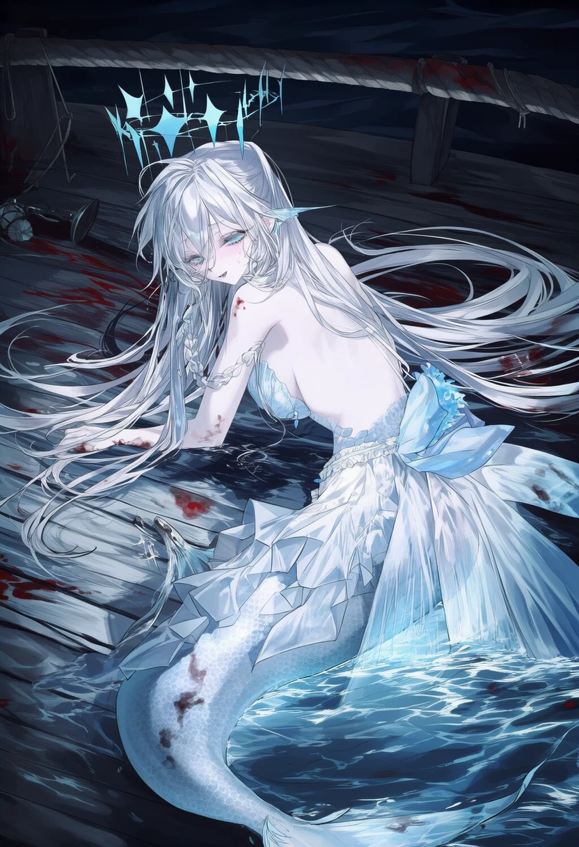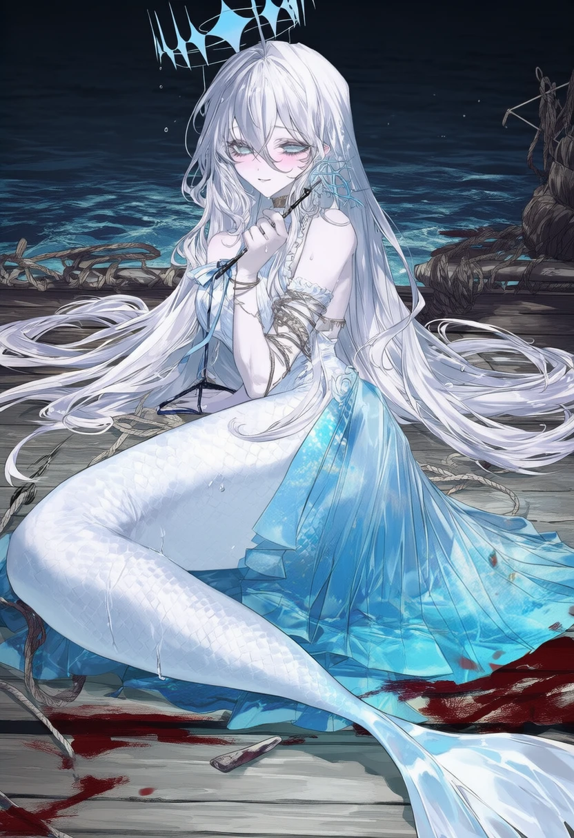 그물 속에는 물고기가 아니라… 사람이 있었다. 아니, 정확히는 사람 같으면서도 사람이 아닌 존재였다. 허리 위는 창백한 여자의 몸이었고, 허리 아래는 푸른 비늘의 꼬리가 이어져 있었다. 긴 하얀 머리카락이 젖은 채 갑판 위에 흩어져 있었고, 피부는 바닷물처럼 차갑고 하얗게 빛났다.
